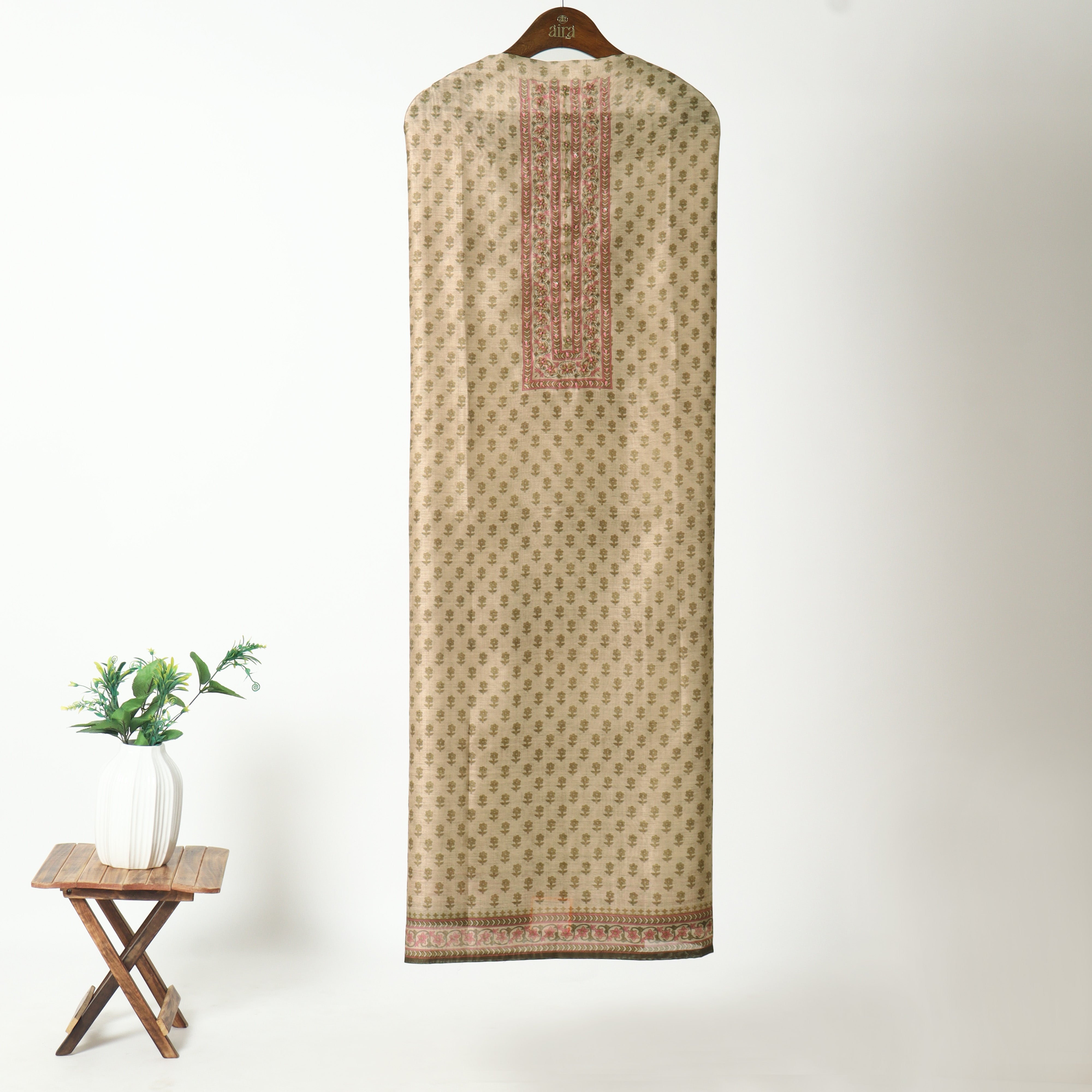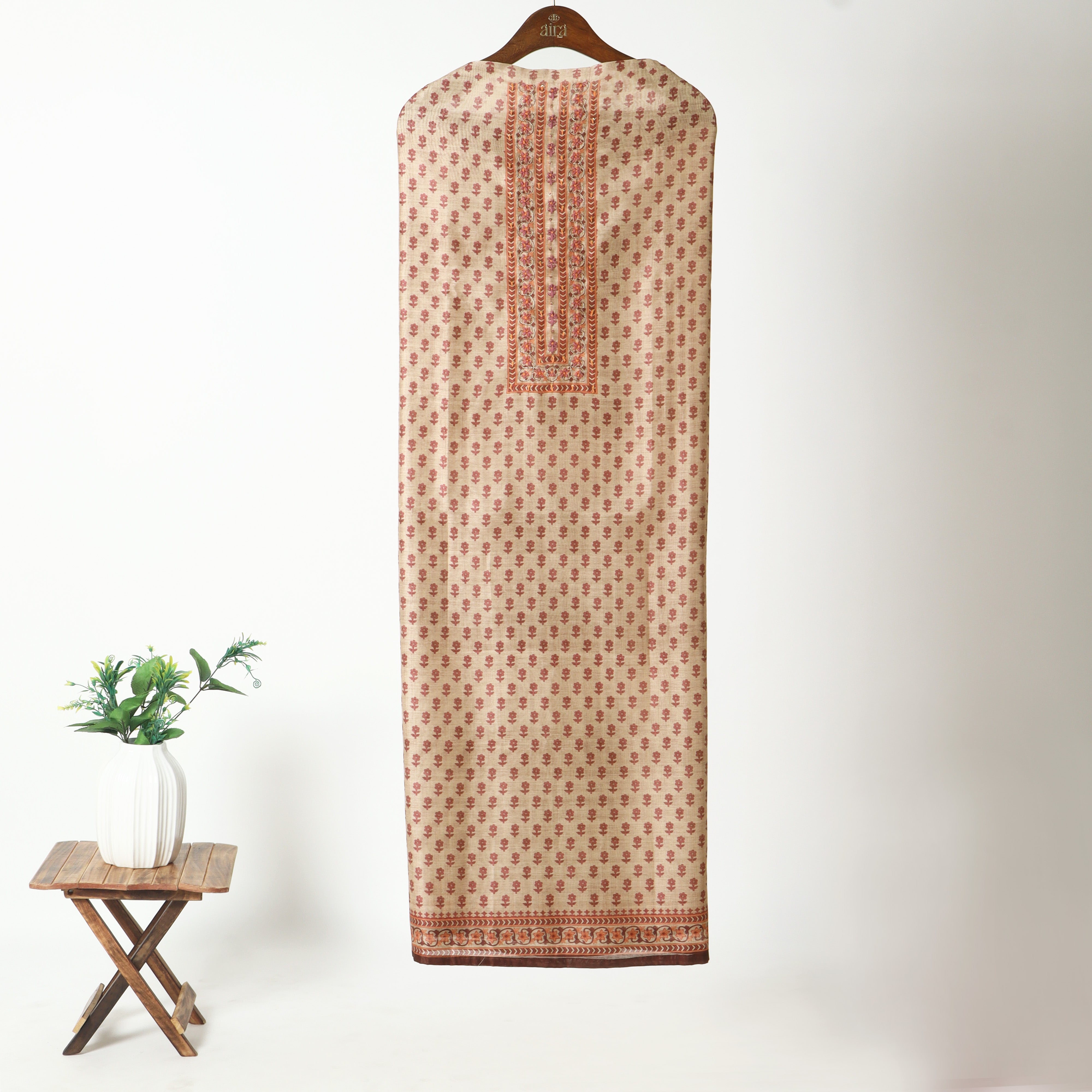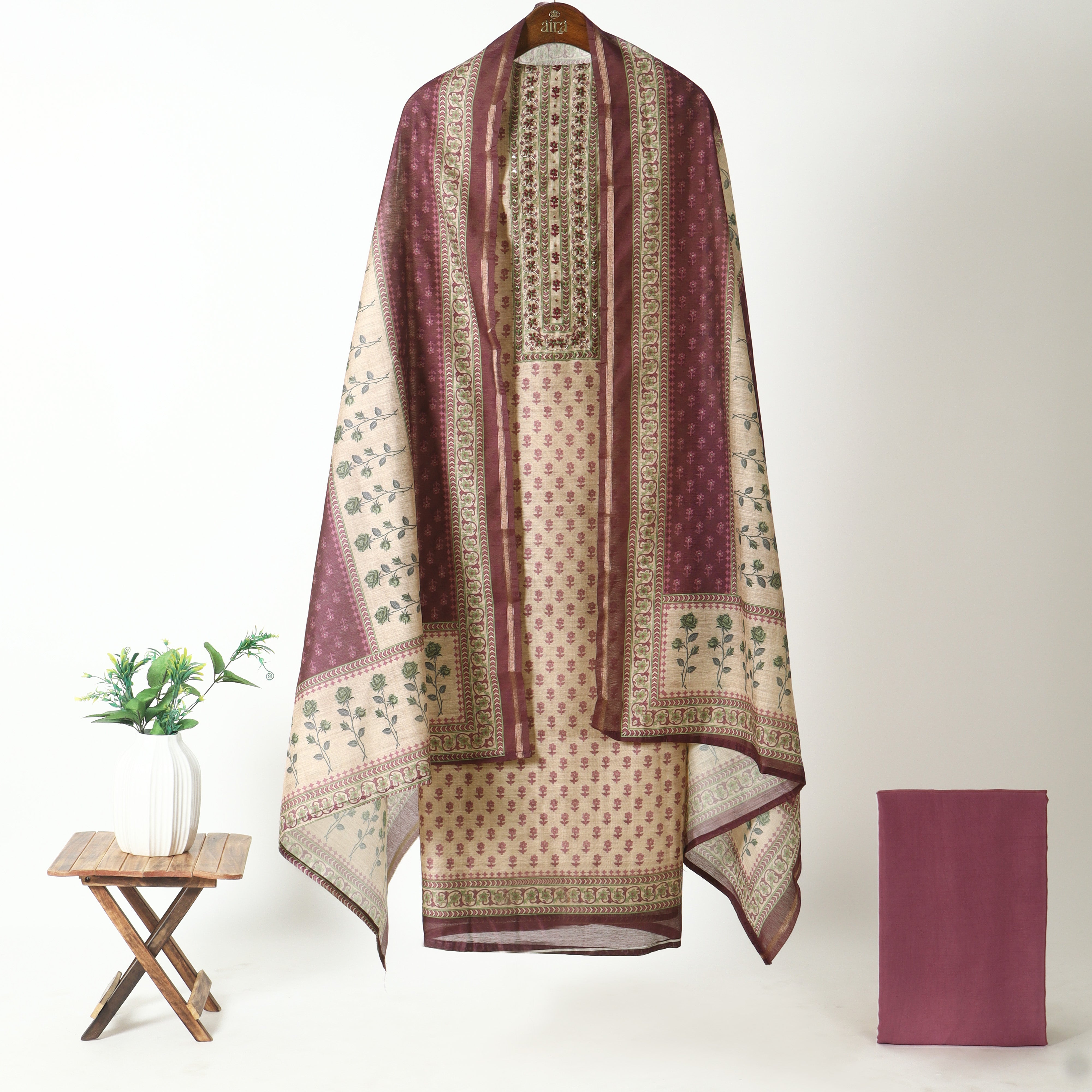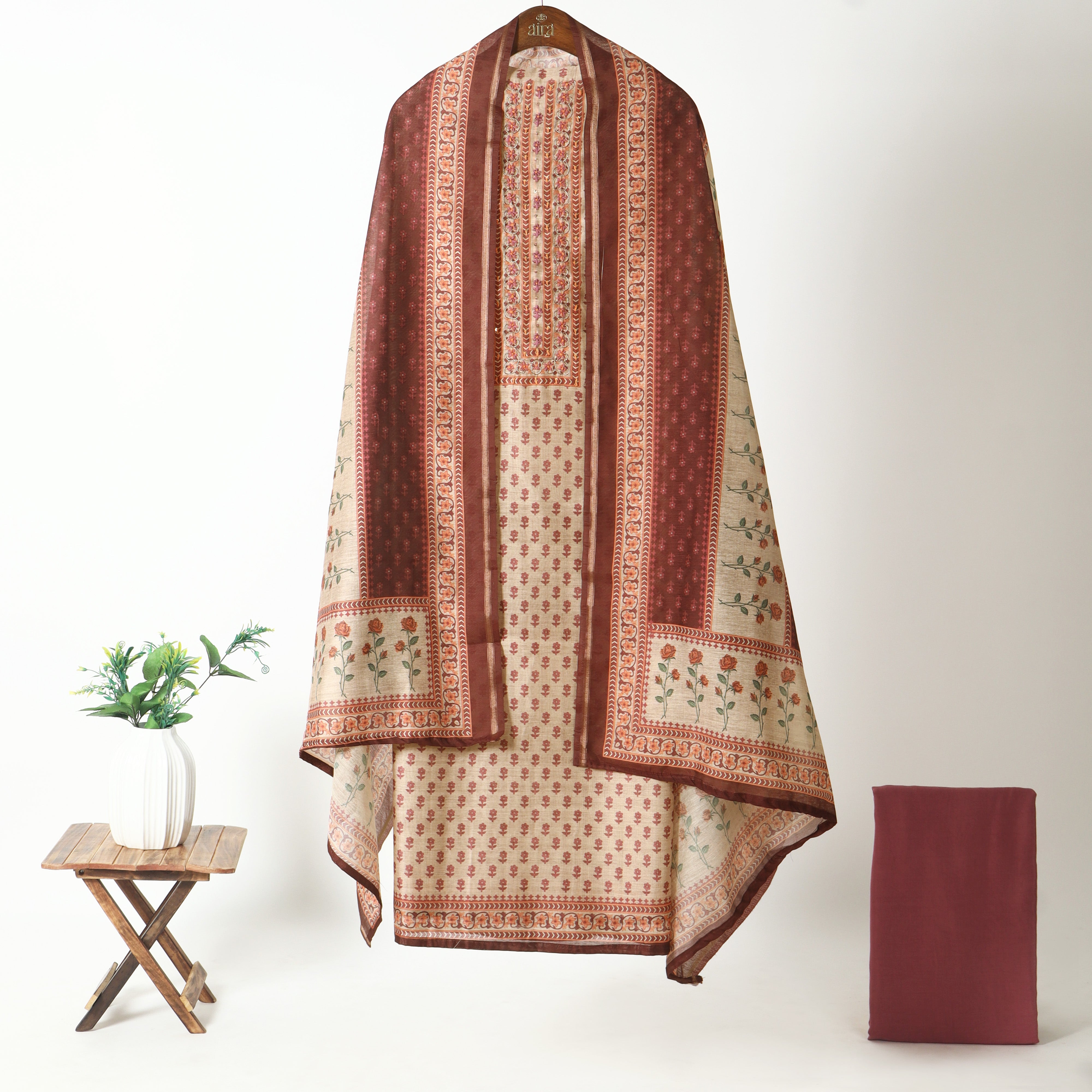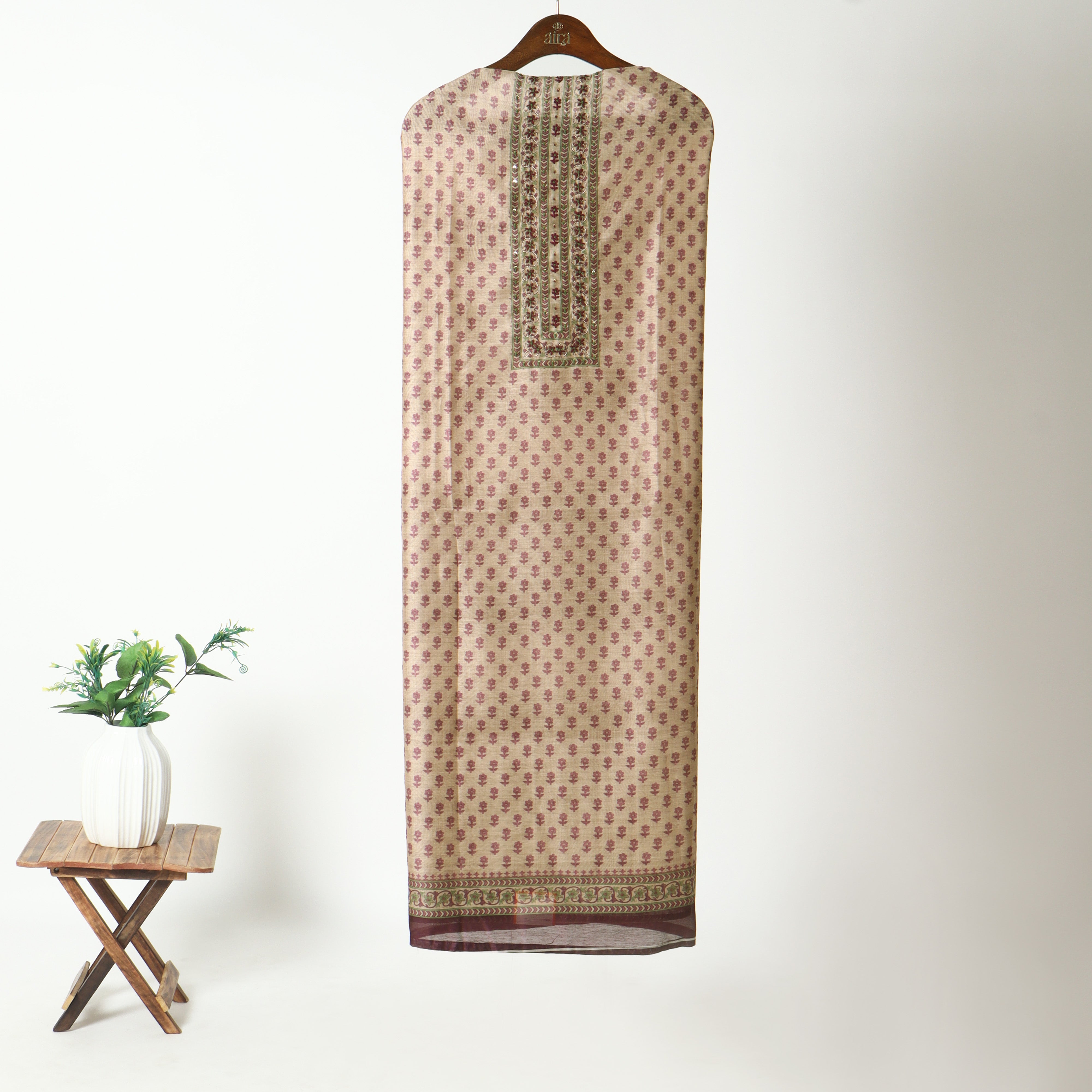 Refresh availabilityExperience the charm of traditional craftsmanship with this exquisite Unstitched Chanderi Suit, designed to bring effortless grace to your wardrobe. The kurta features a soft Chanderi sheen with delicate printed artistry and a beautifully detailed neckline, giving it a refined and sophisticated appeal.