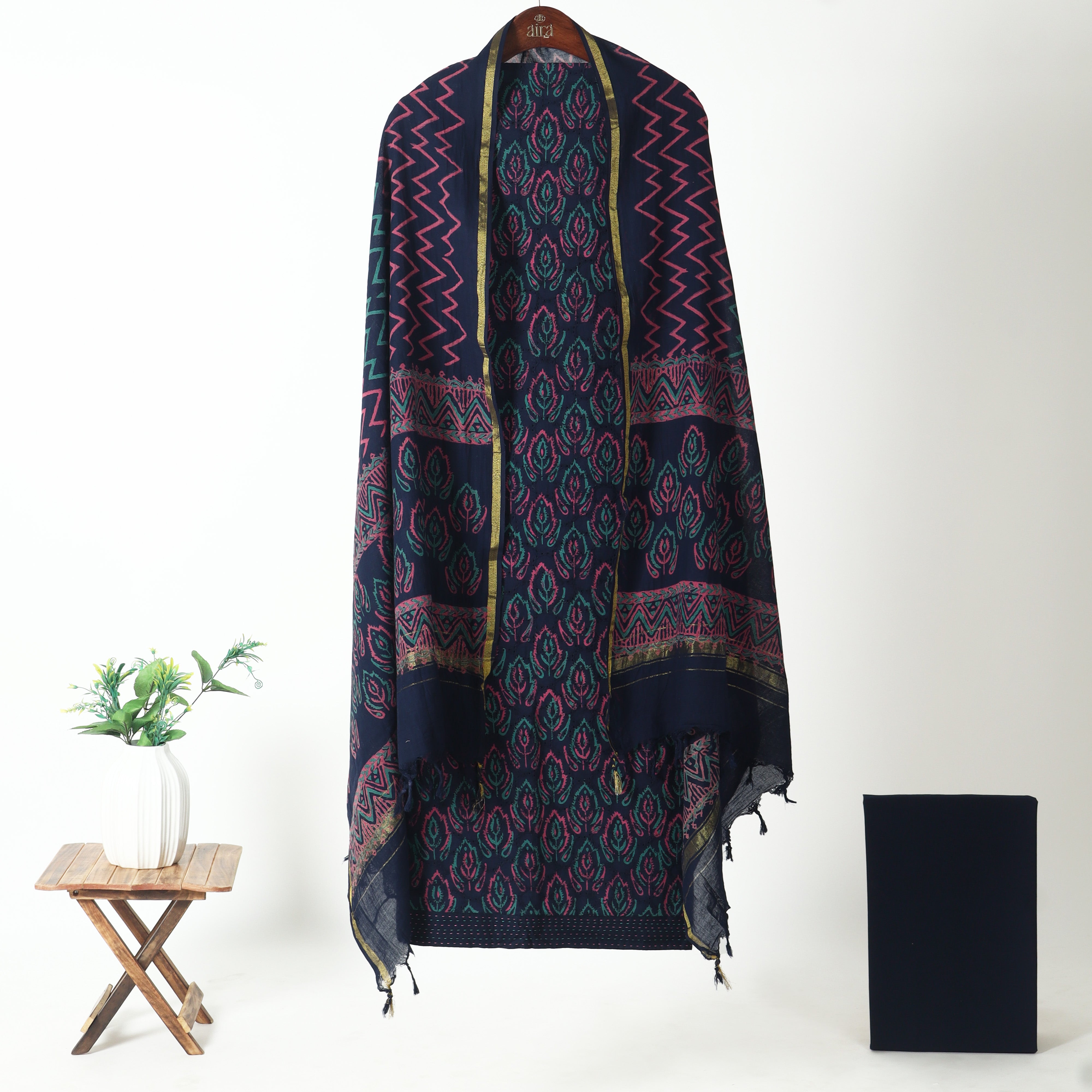 Refresh availabilityIndulge in timeless elegance with this beautifully crafted Unstitched Chanderi Suit, designed to elevate your everyday and occasion wear. The kurta features Chanderi’s signature soft sheen paired with artistic printed detailing and a tastefully highlighted neckline, giving it a sophisticated and graceful appeal.