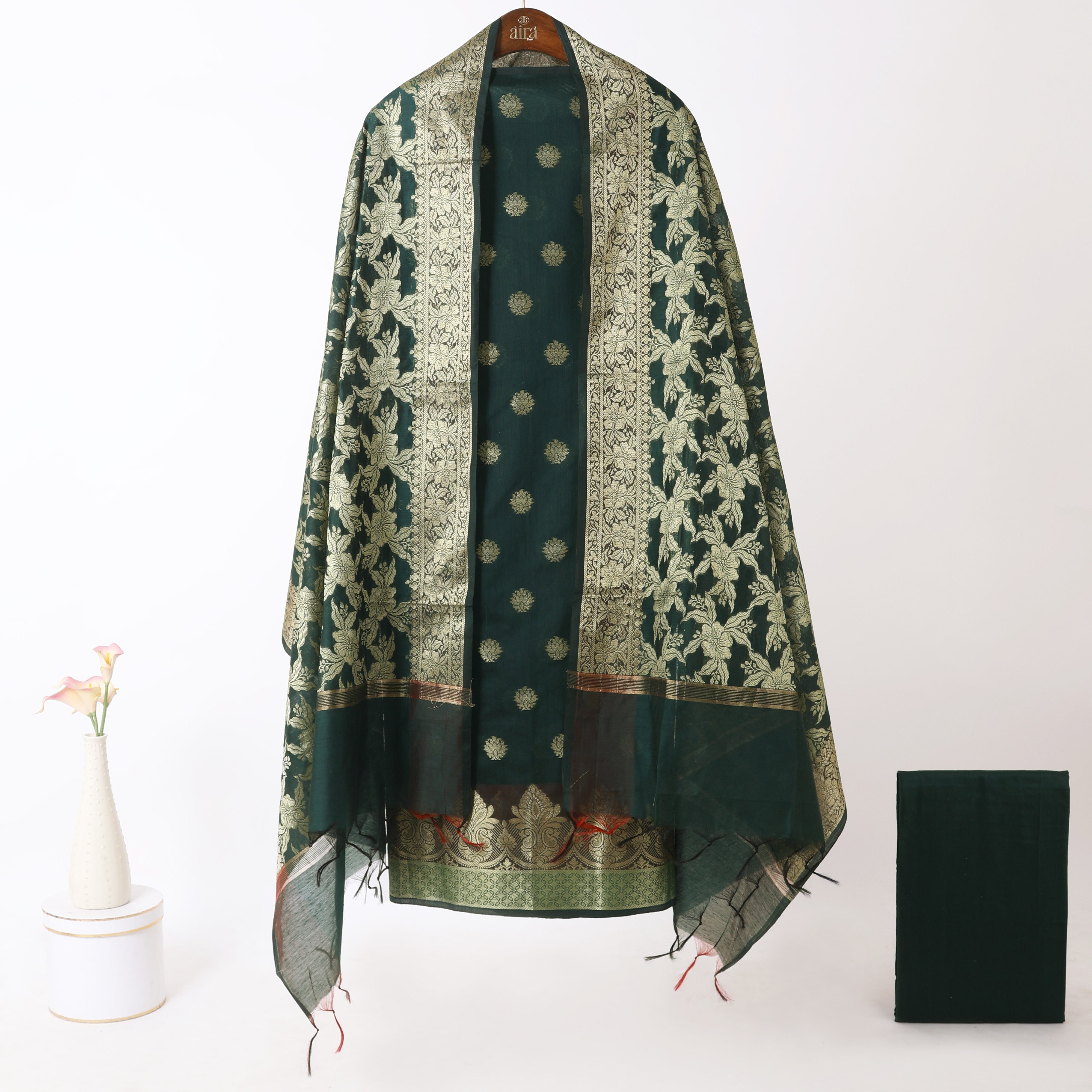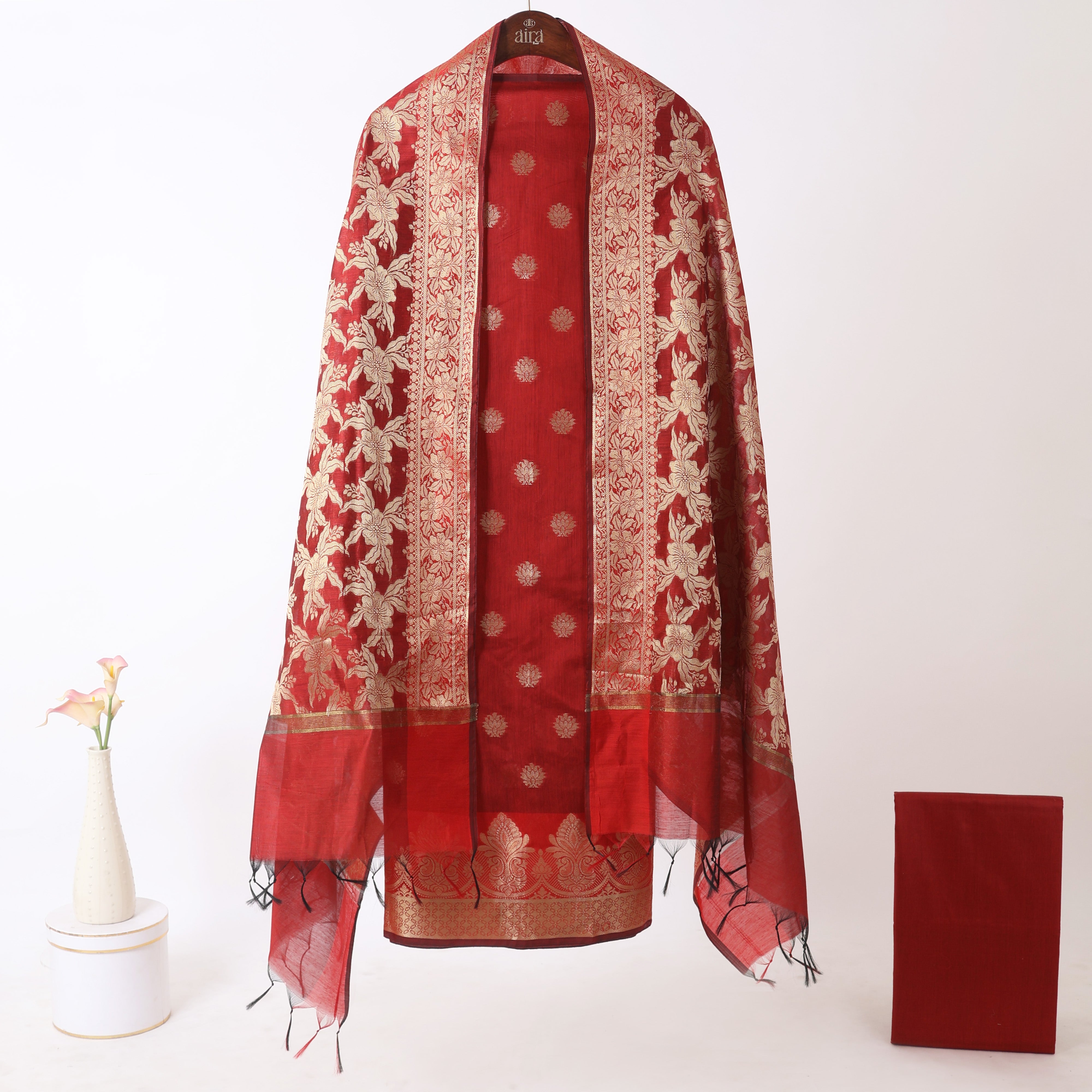 Refresh availabilityGive your ethnic wardrobe a stylish upgrade with this Unstitched Chanderi Suit Set. Crafted from premium Chanderi fabric, this suit offers a rich sheen, smooth texture and elegant fall, making it perfect for festive and casual occasions. The set includes an unstitched top, bottom and a beautifully designed Chanderi dupatta, allowing you to customize the fit and style as per your preference.