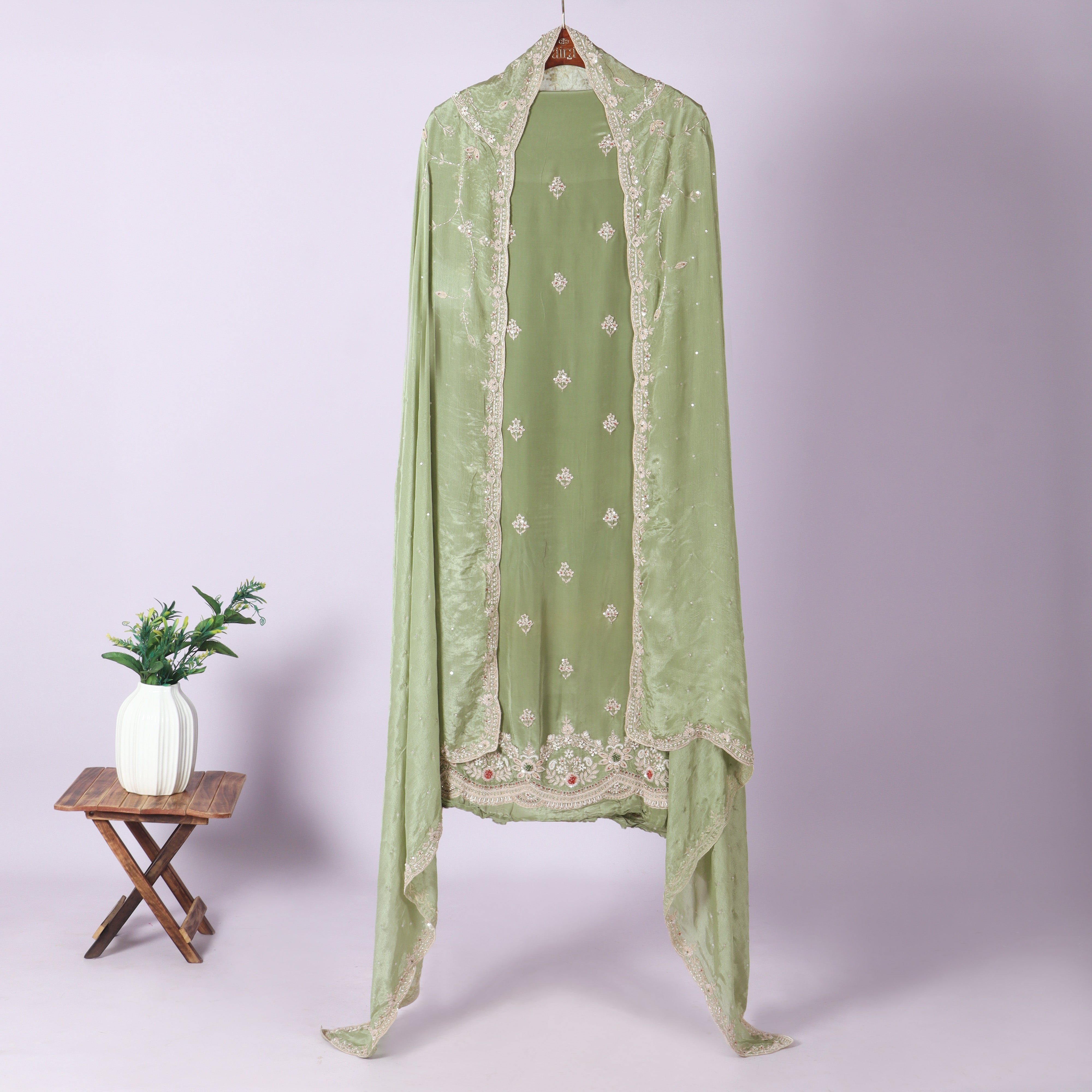 Refresh availabilityCrafted from luxuriously soft crepe, this unstitched suit brings a graceful fall and a refined texture that feels effortlessly stylish. The fabric drapes beautifully, offering a fluid silhouette once stitched, making it ideal for both casual elegance and festive dressing. With its lightweight feel and smooth finish, this crepe suit lets you customise your look with ease—be it a contemporary style or a traditional charm. A perfect blend of comfort and sophistication, ready to be tailored into your signature outfit.
