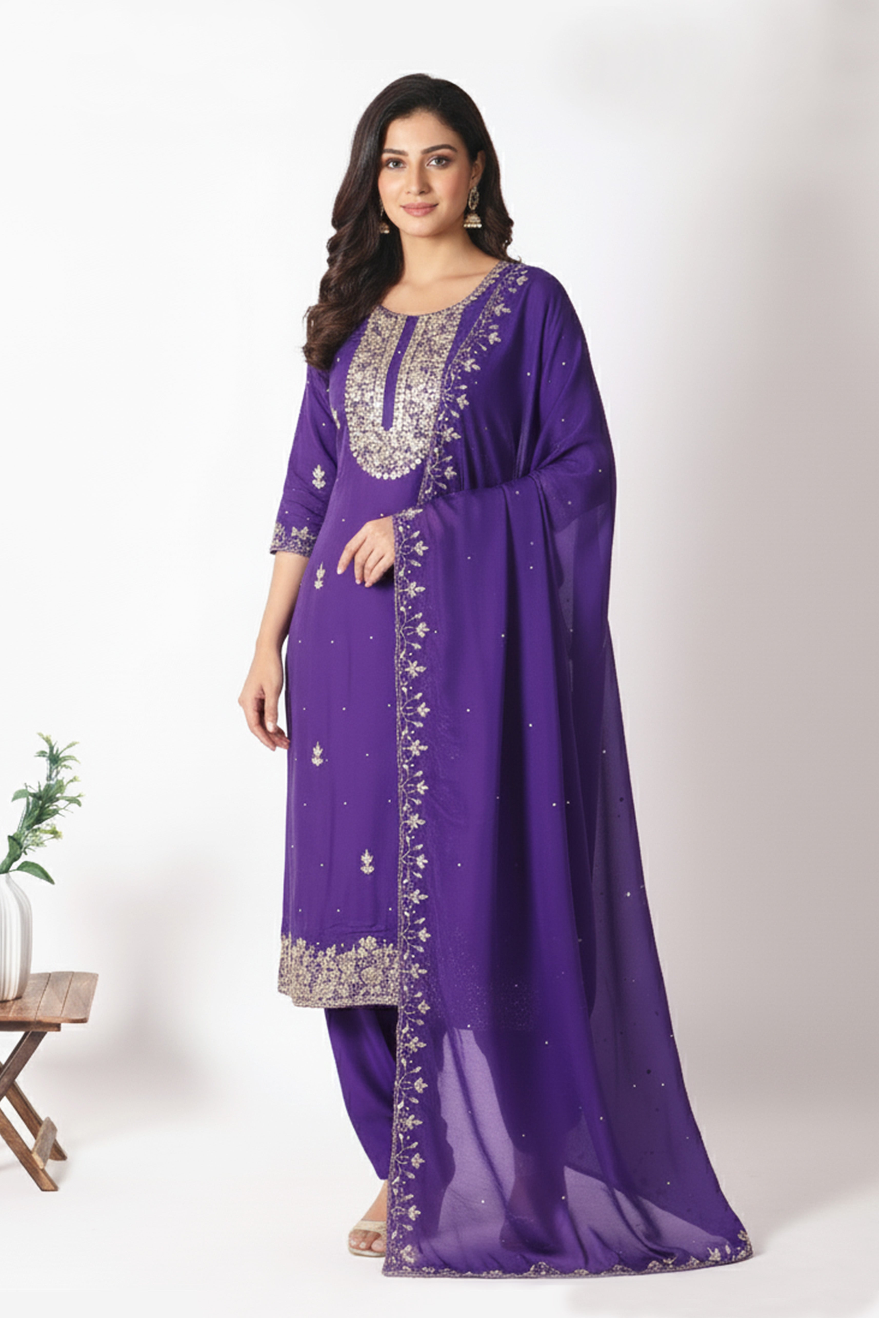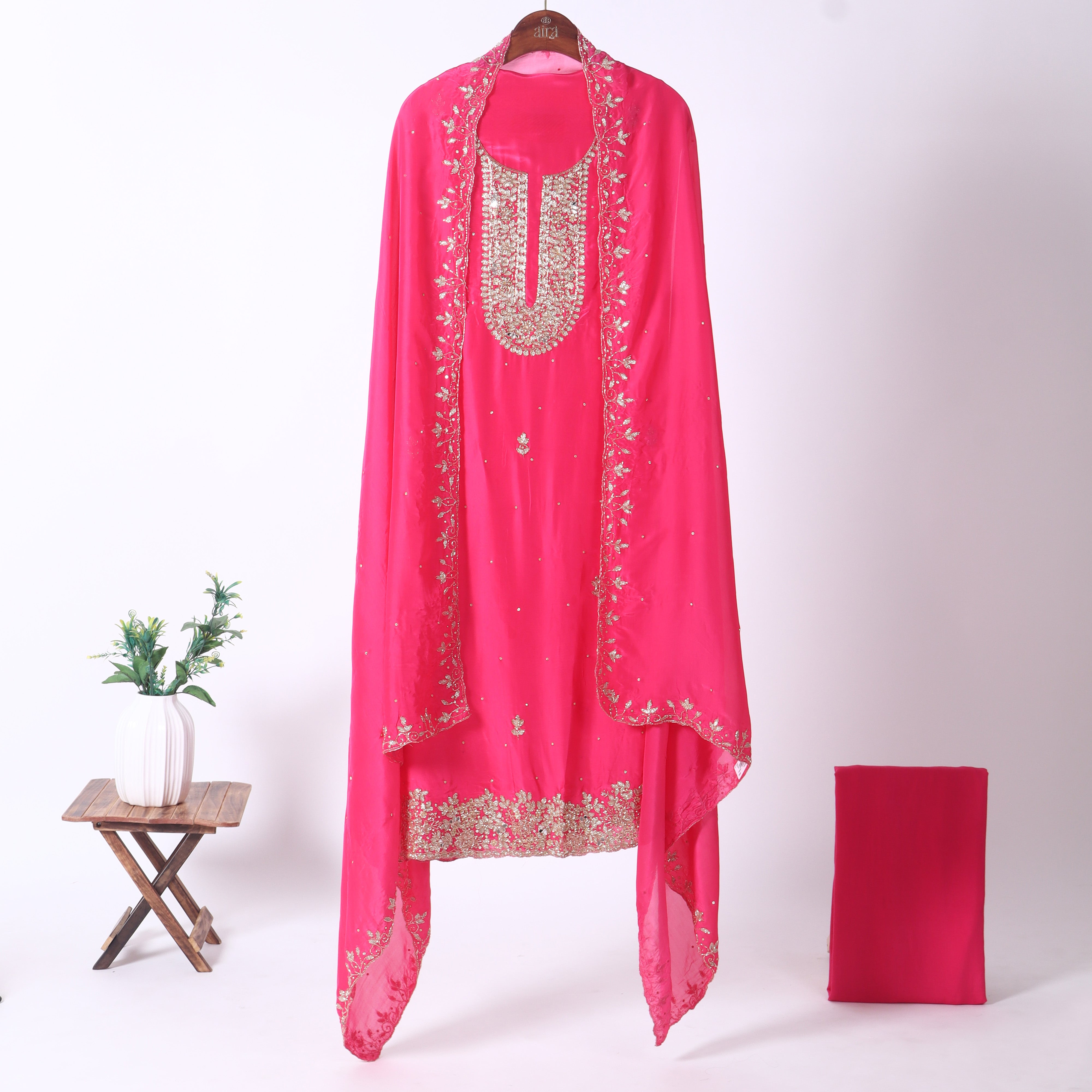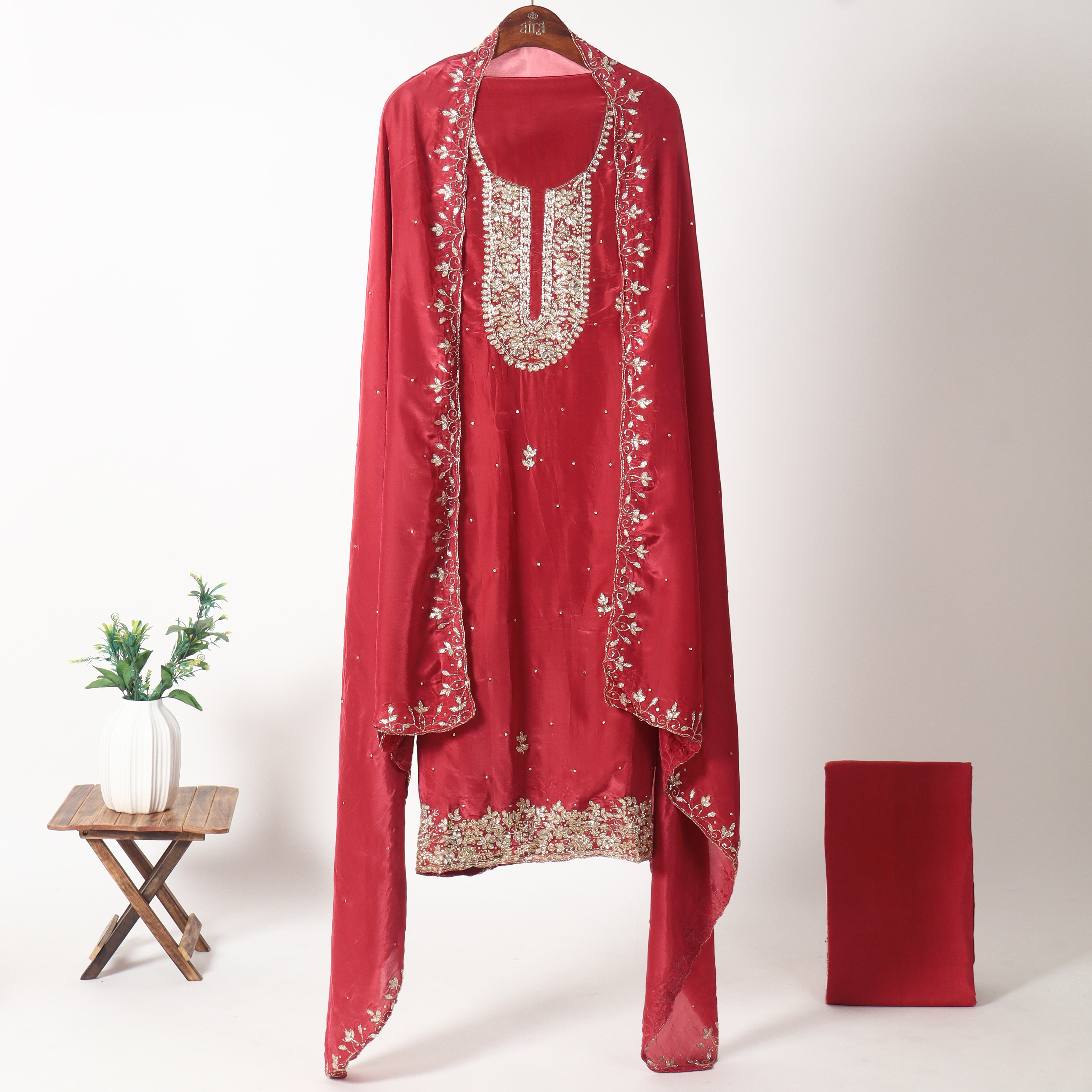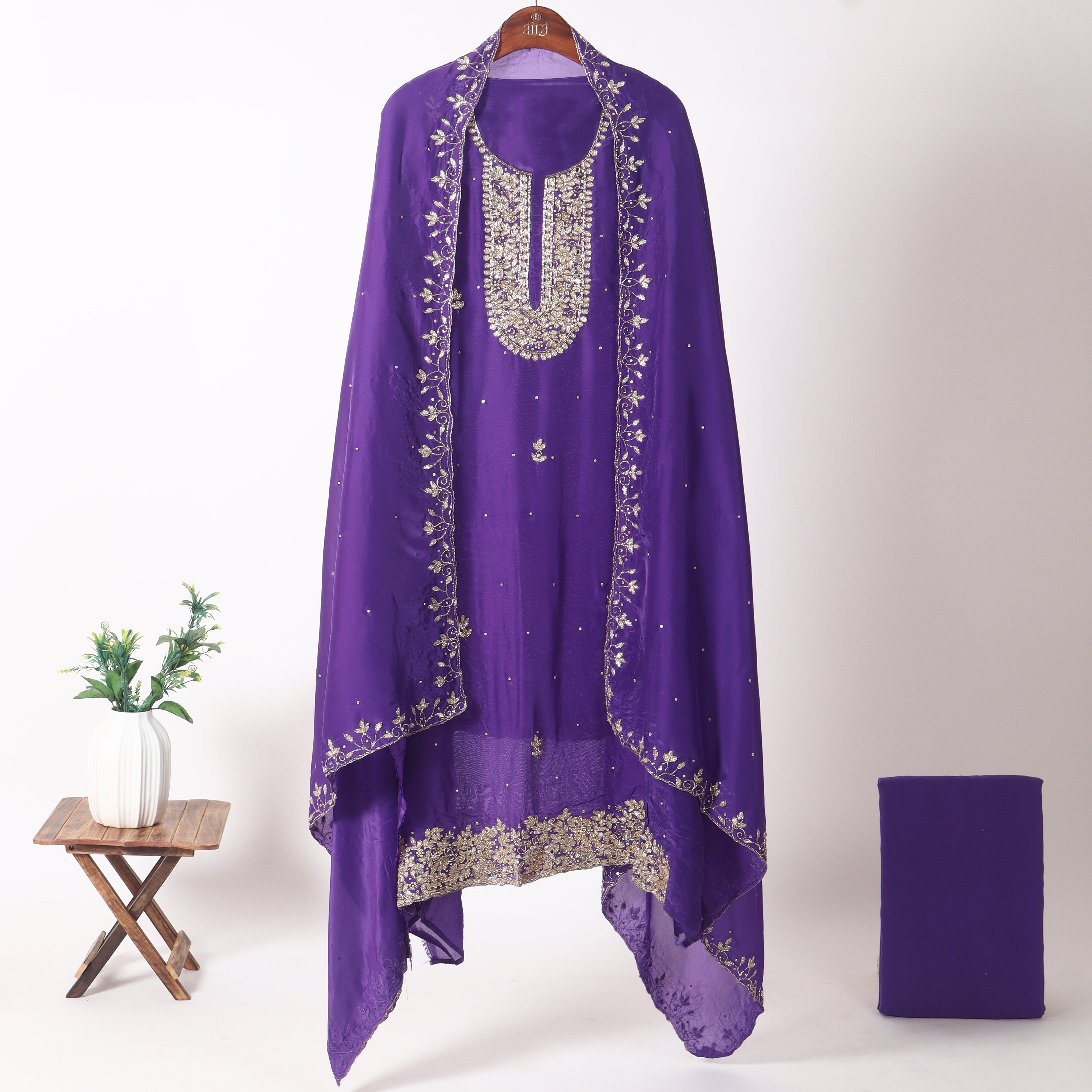 Refresh availabilityElevate your ethnic wardrobe with this elegant unstitched crepe suit. Crafted from premium quality crepe fabric, it offers a soft, flowy drape and a refined sheen. The suit features intricate embroidery that adds a touch of sophistication, making it perfect for festive gatherings, weddings, and special occasions. Pair it with statement jewelry and heels to complete the graceful look.