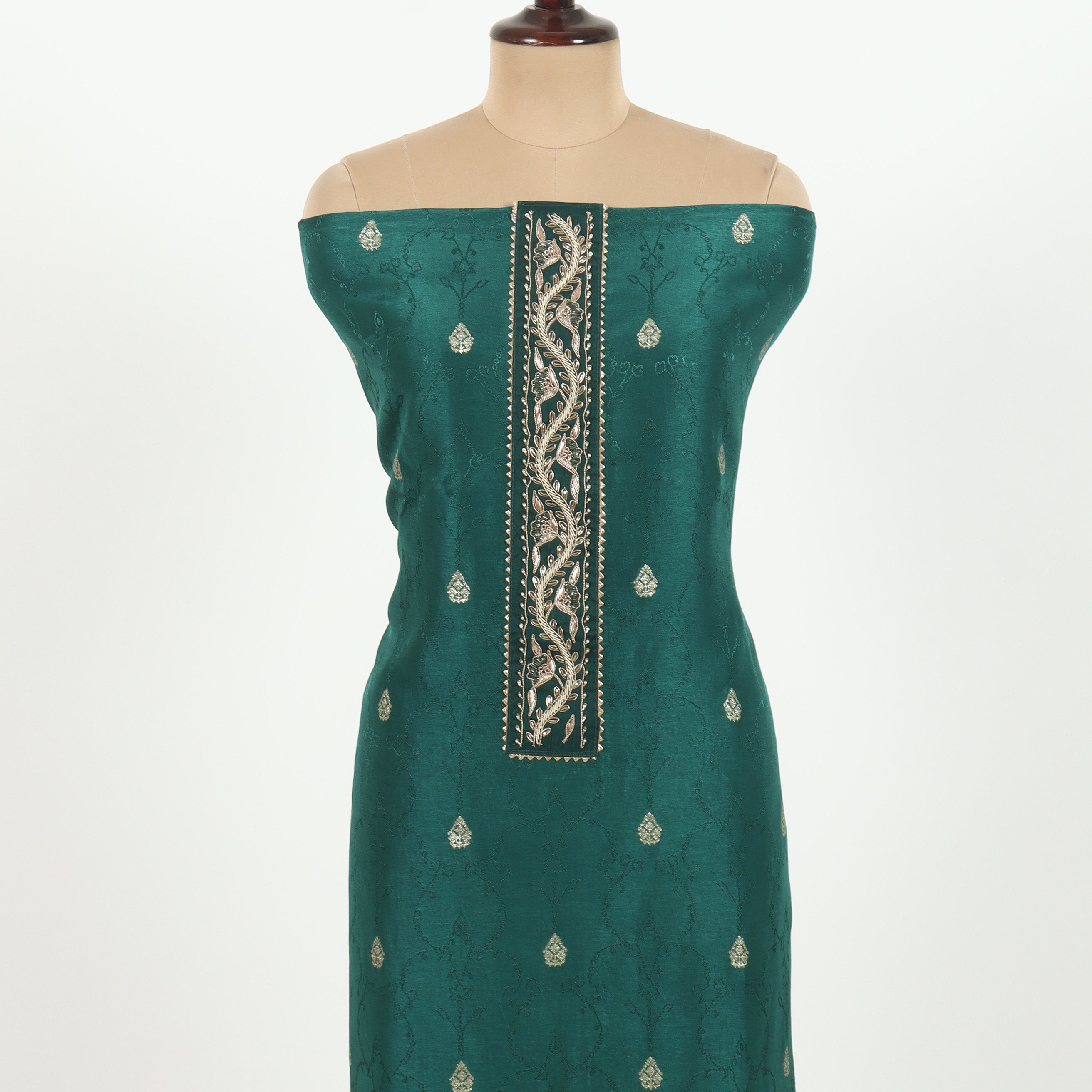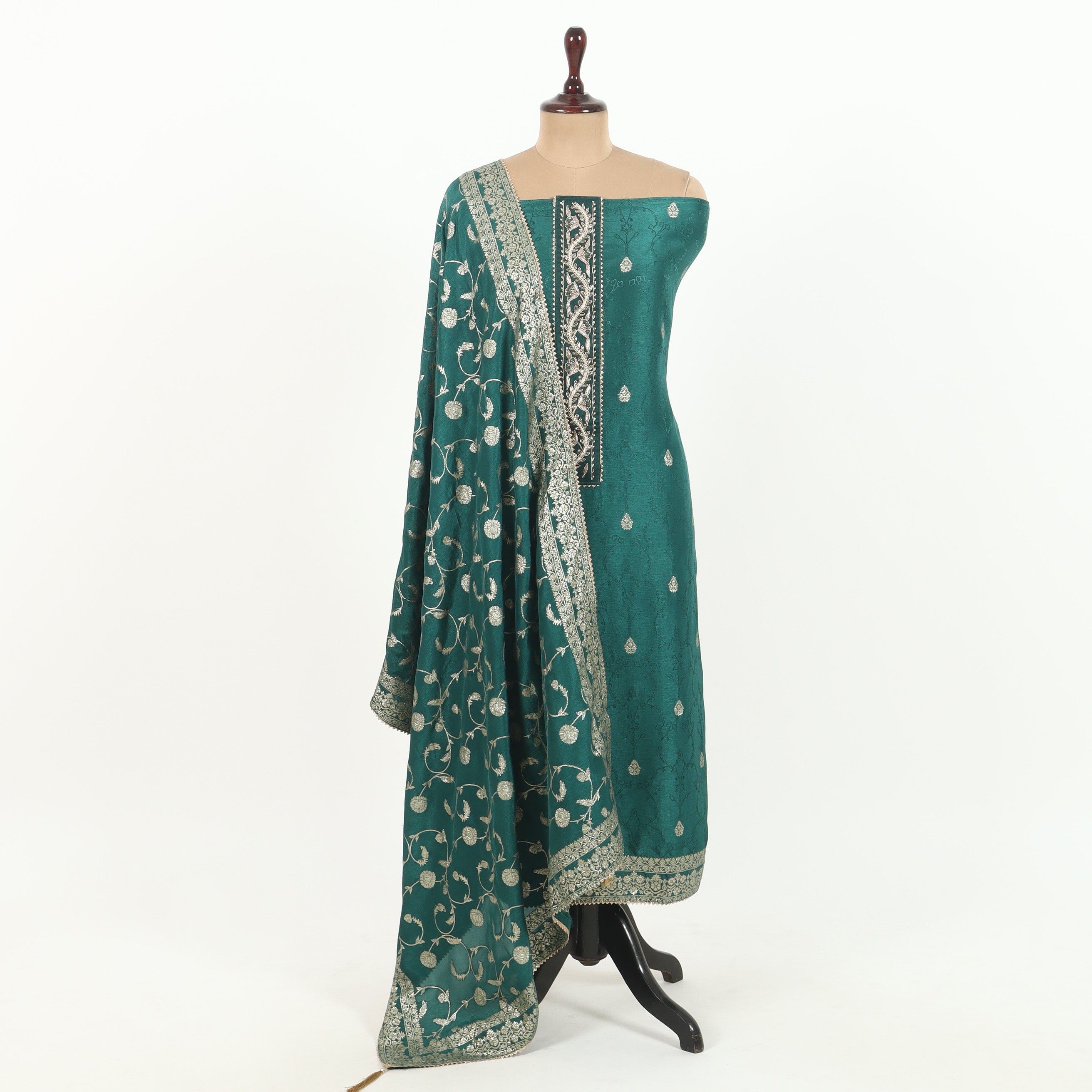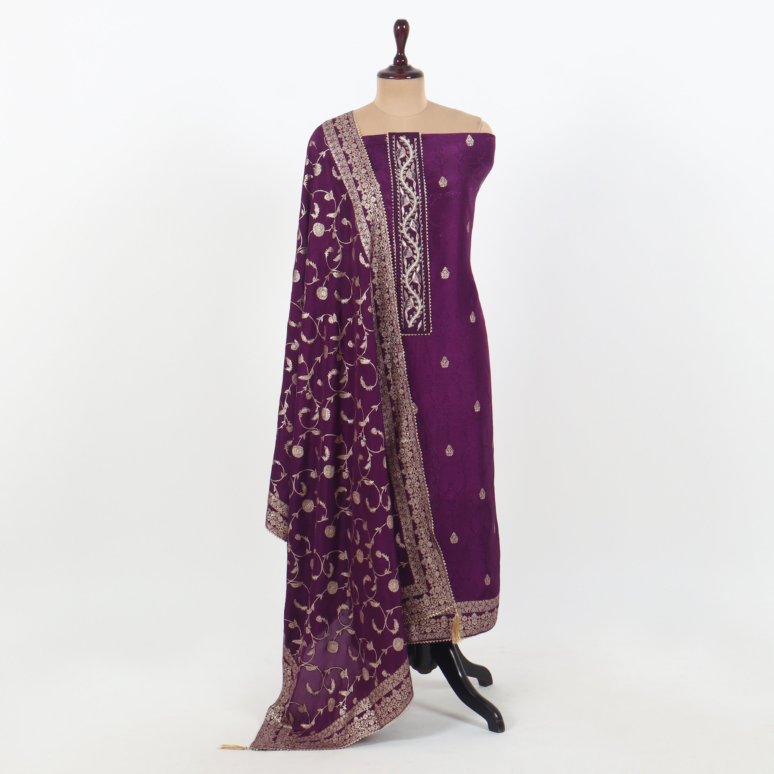 Refresh availabilityCrafted from premium Dola silk, this unstitched suit offers a rich, textured fabric known for its lightweight sheen and durability. Perfect for tailoring to your exact measurements, it allows for a bespoke fit and personalized style, making it an ideal choice for elegant occasions or daily wear with a refined touch.