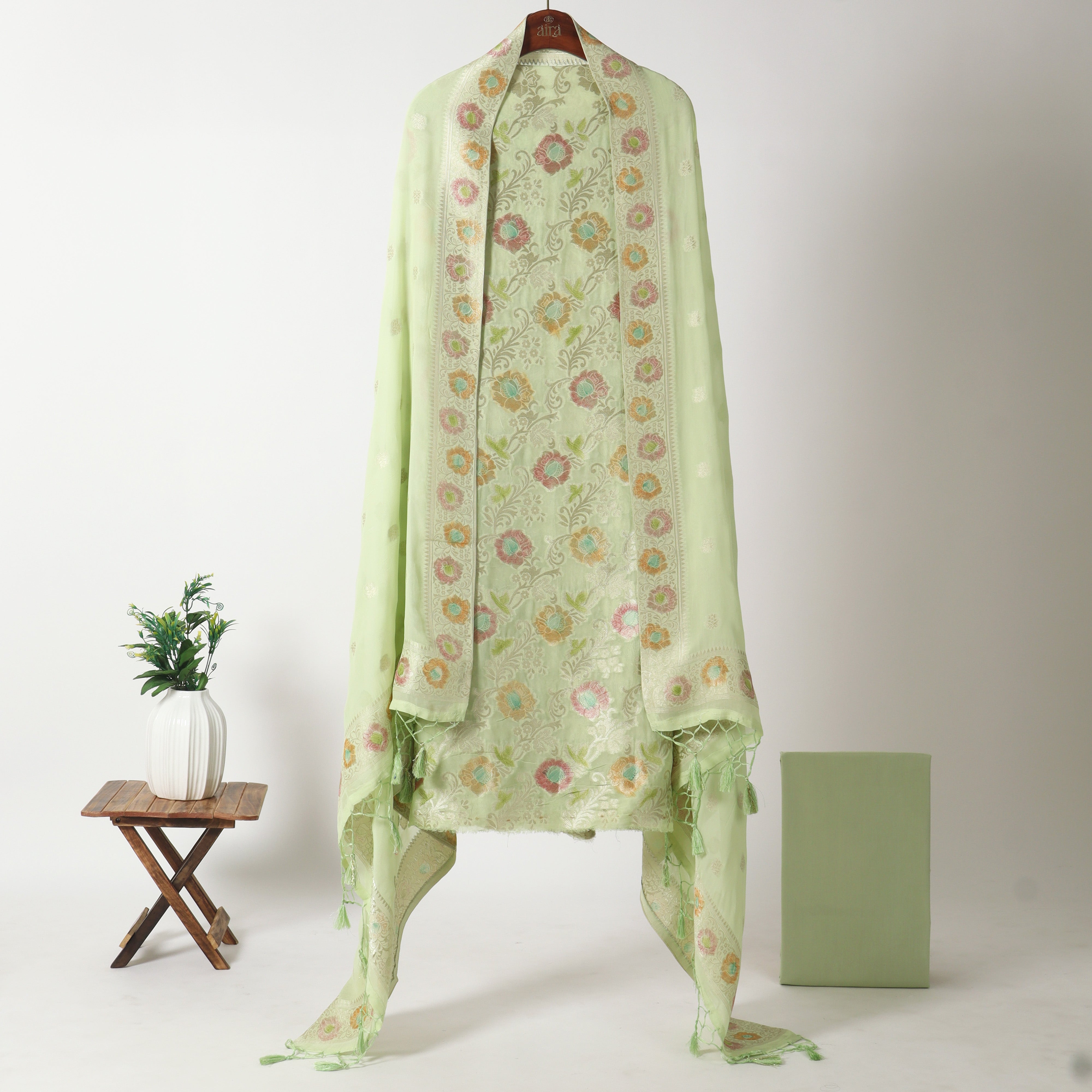 Paired with a matching georgette dupatta, enhanced with fine thread or zari work, and a complementing bottom fabric, this ensemble allows you to customize your fit and style effortlessly. Ideal for festive occasions, family gatherings, or elegant evening outings, this suit blends grace, comfort, and timeless appeal in perfect harmony.