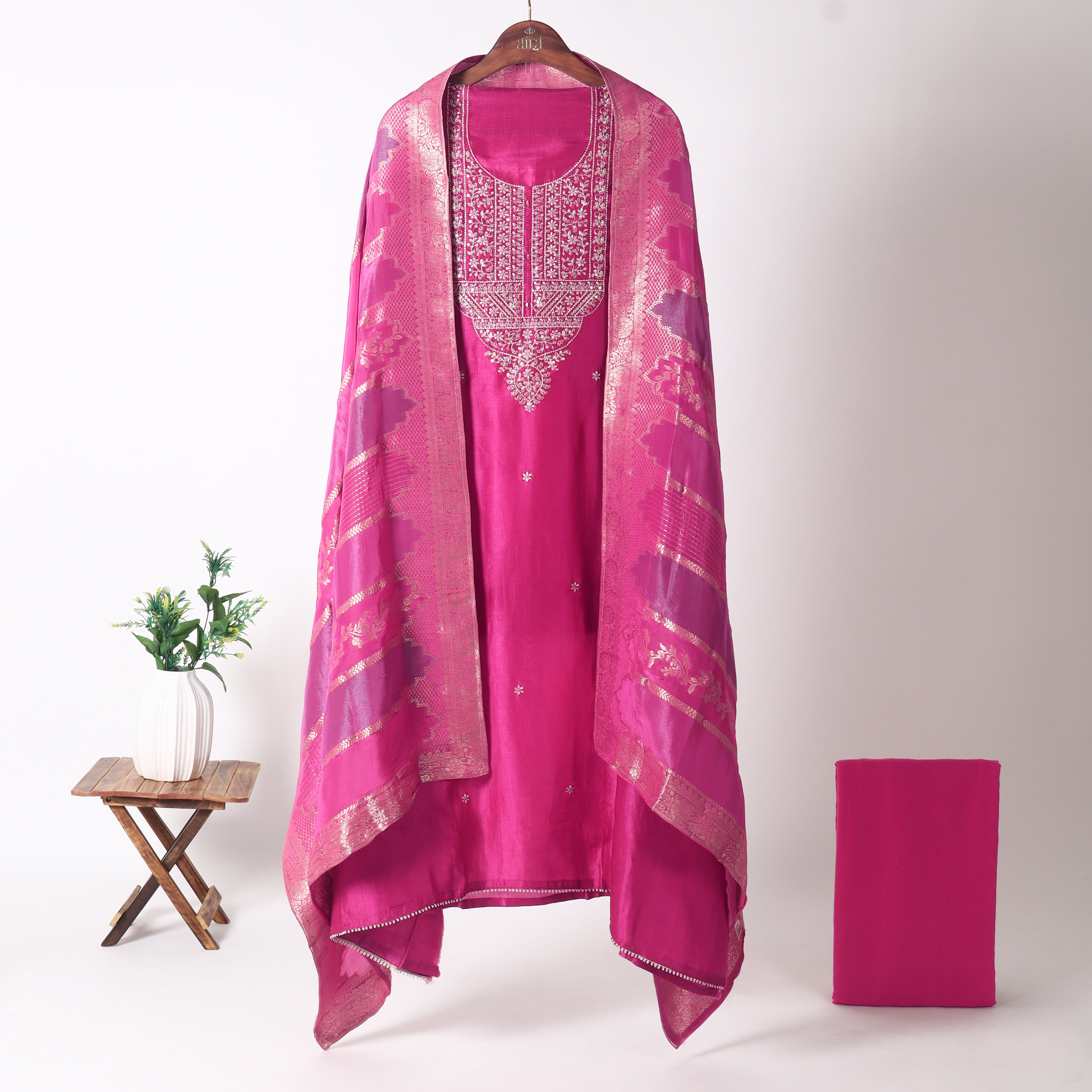 Refresh availabilityCrafted from airy muslin, this unstitched suit offers a cool, comfortable feel with a gentle matte texture and easy drape. Tailor as a straight-cut, A-line or Anarkali silhouette; keep it minimal or embellish with delicate embroidery or prints. Perfect for daytime functions, casual festivities, and refined daily dressing. (Light colours may be slightly sheer—lining recommended for the kurta.