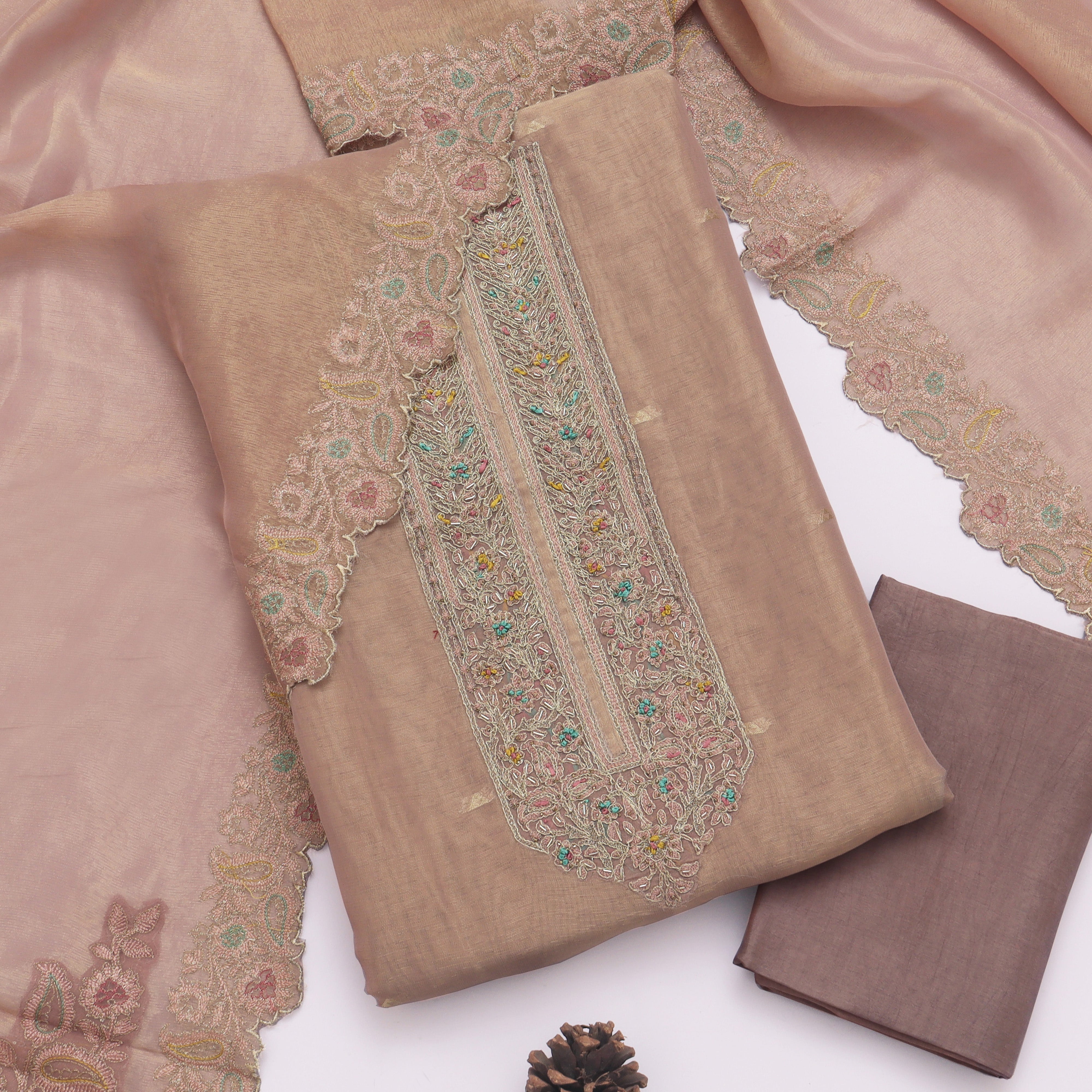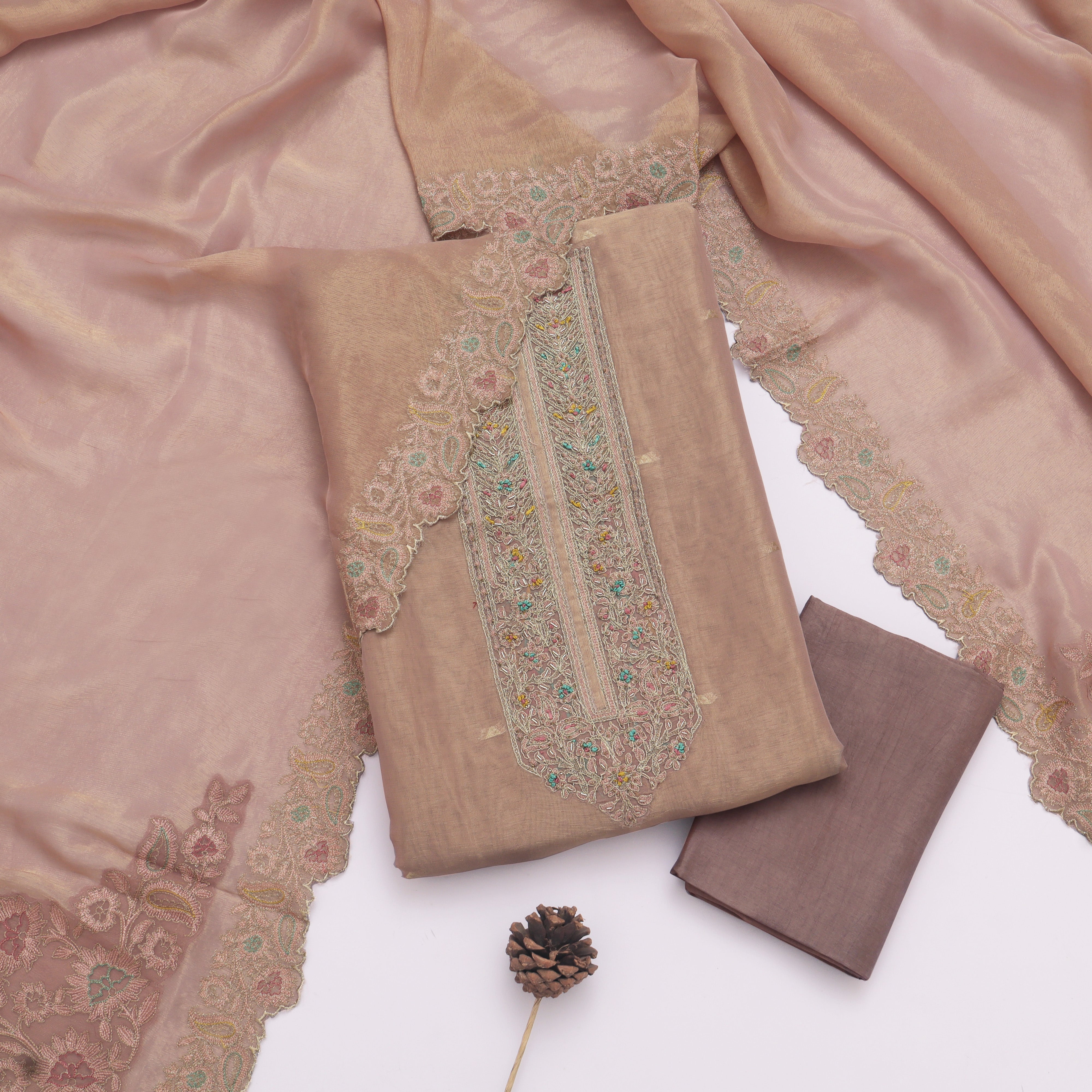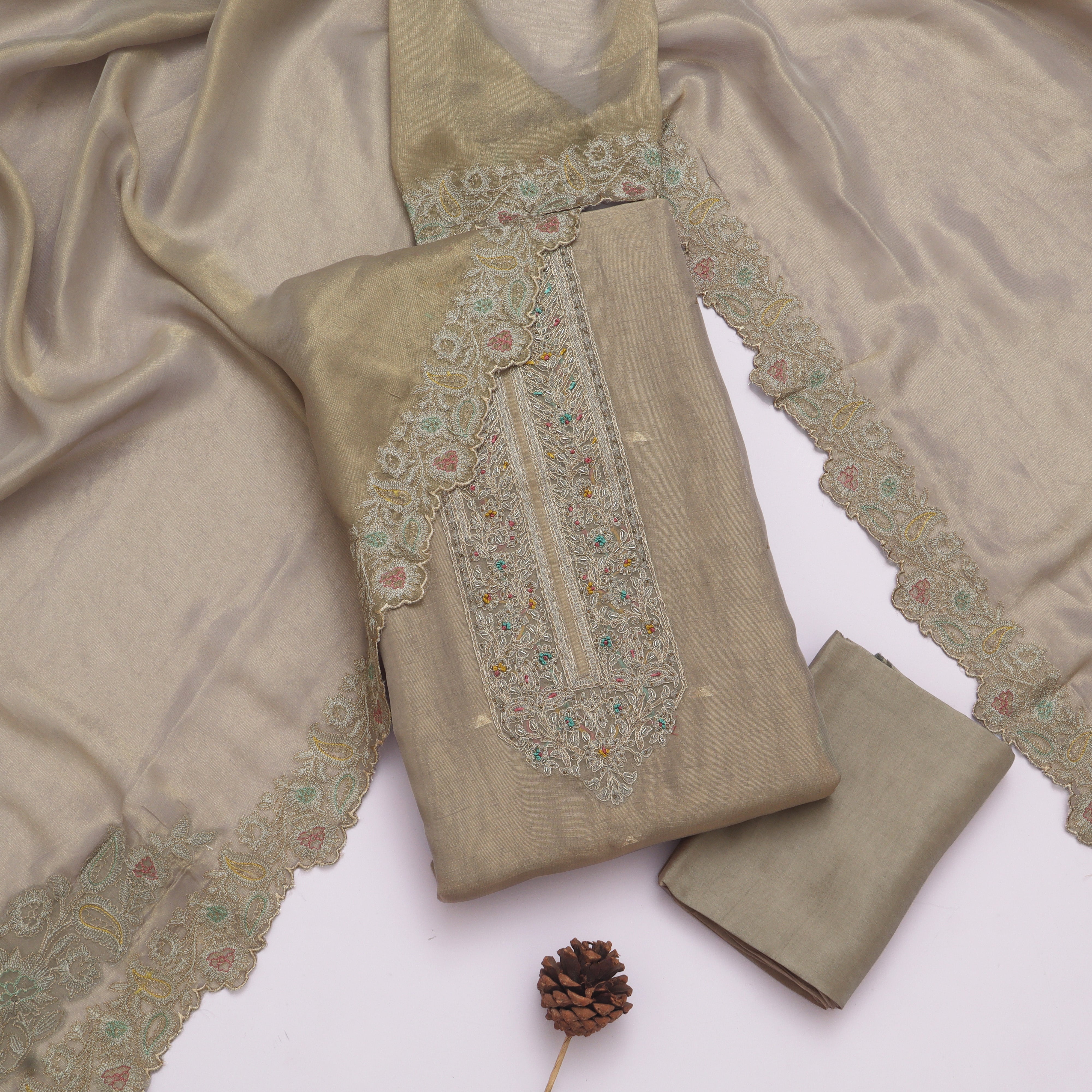 Refresh availabilityElevate your ethnic wardrobe with this luxurious unstitched tissue suit. The kameez features intricate thread embroidery along the neckline with delicate pastel floral accents, adding a timeless charm. Paired with a soft, lightweight dupatta adorned with scalloped embroidered borders and a plain bottom, this ensemble is perfect for festive occasions, weddings, and special celebrations. Its unstitched design allows you to customize the fit and style to your preference, making it a versatile addition to your collection.