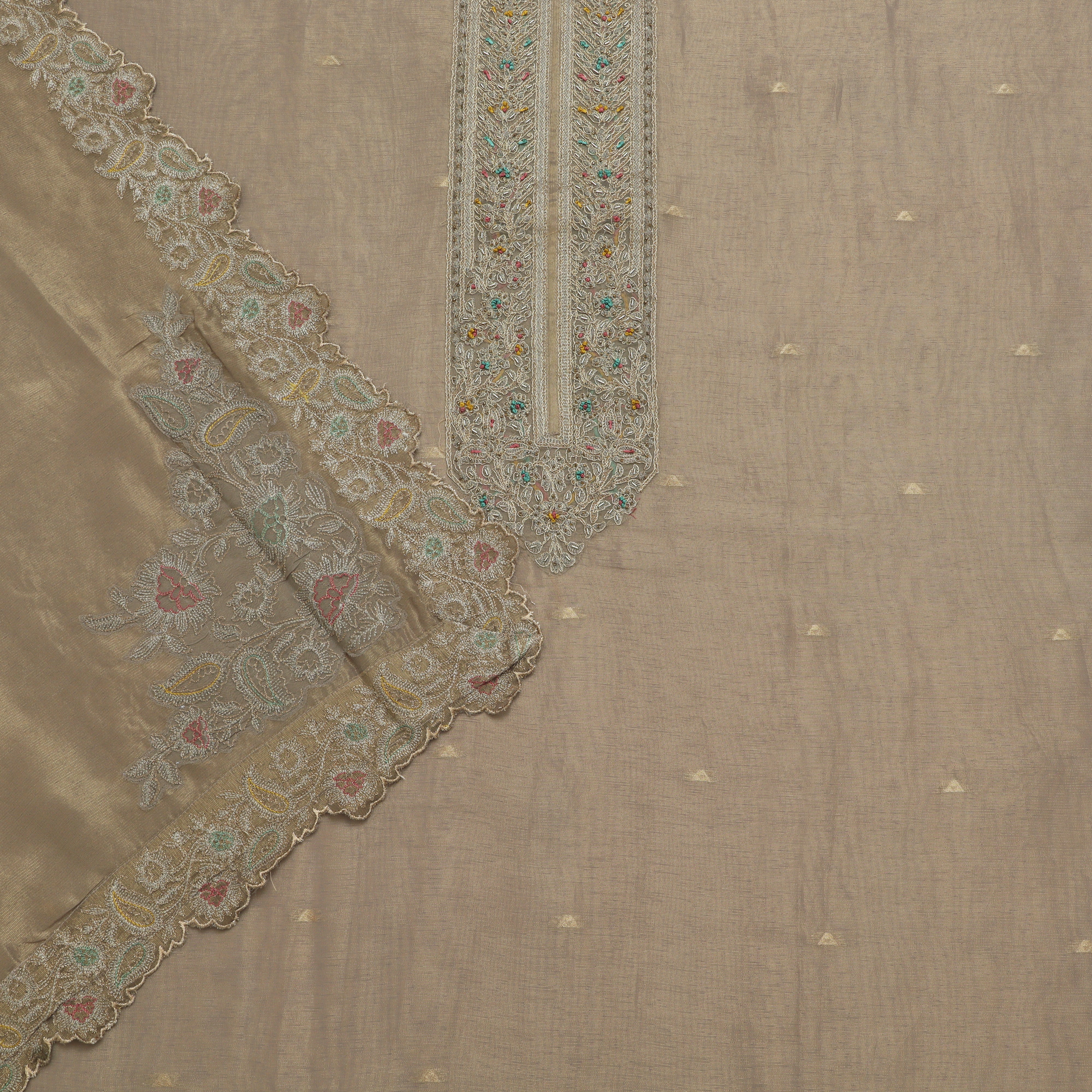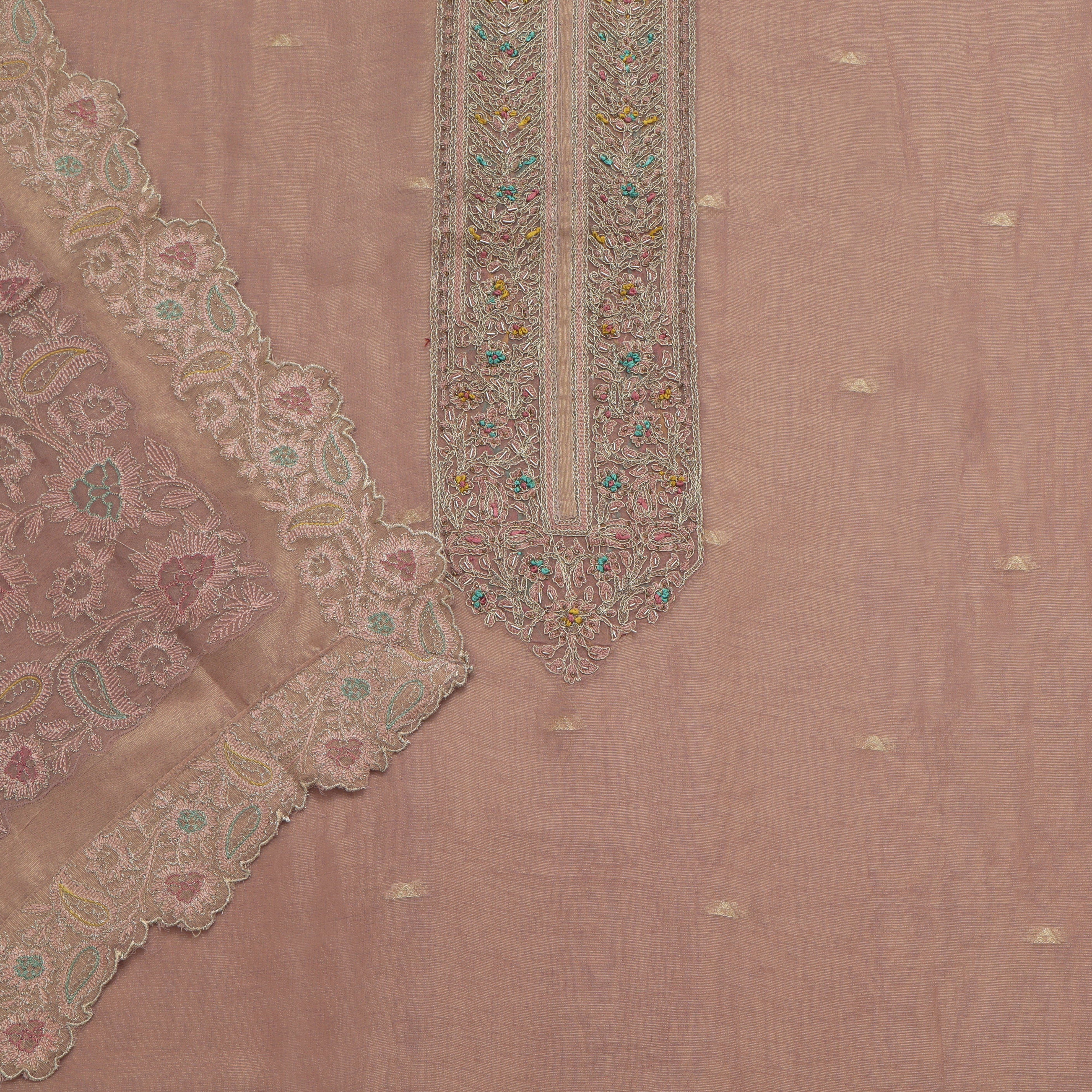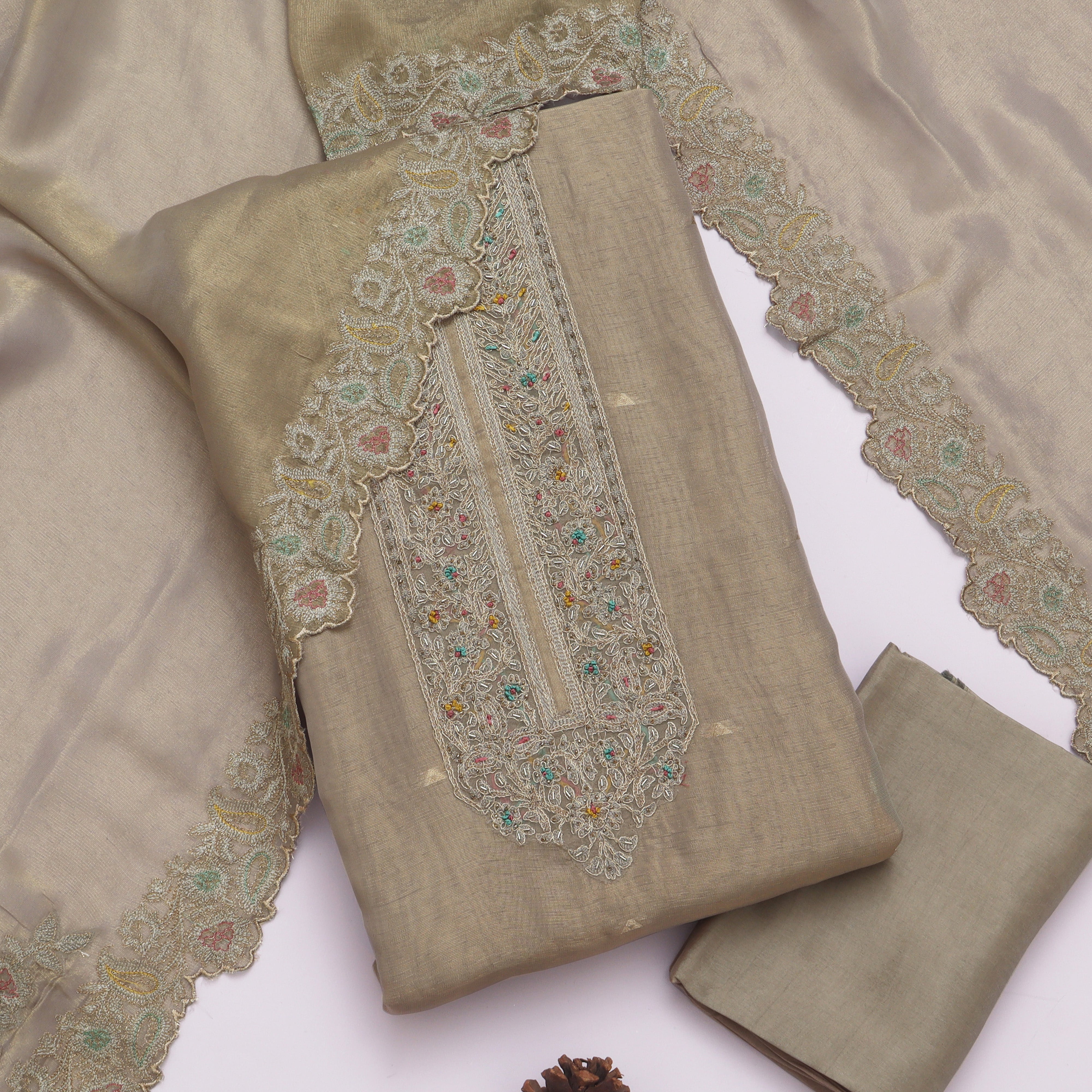 Refresh availabilityElevate your ethnic wardrobe with this luxurious unstitched tissue suit. The kameez features intricate thread embroidery along the neckline with delicate pastel floral accents, adding a timeless charm. Paired with a soft, lightweight dupatta adorned with scalloped embroidered borders and a plain bottom, this ensemble is perfect for festive occasions, weddings, and special celebrations. Its unstitched design allows you to customize the fit and style to your preference, making it a versatile addition to your collection.