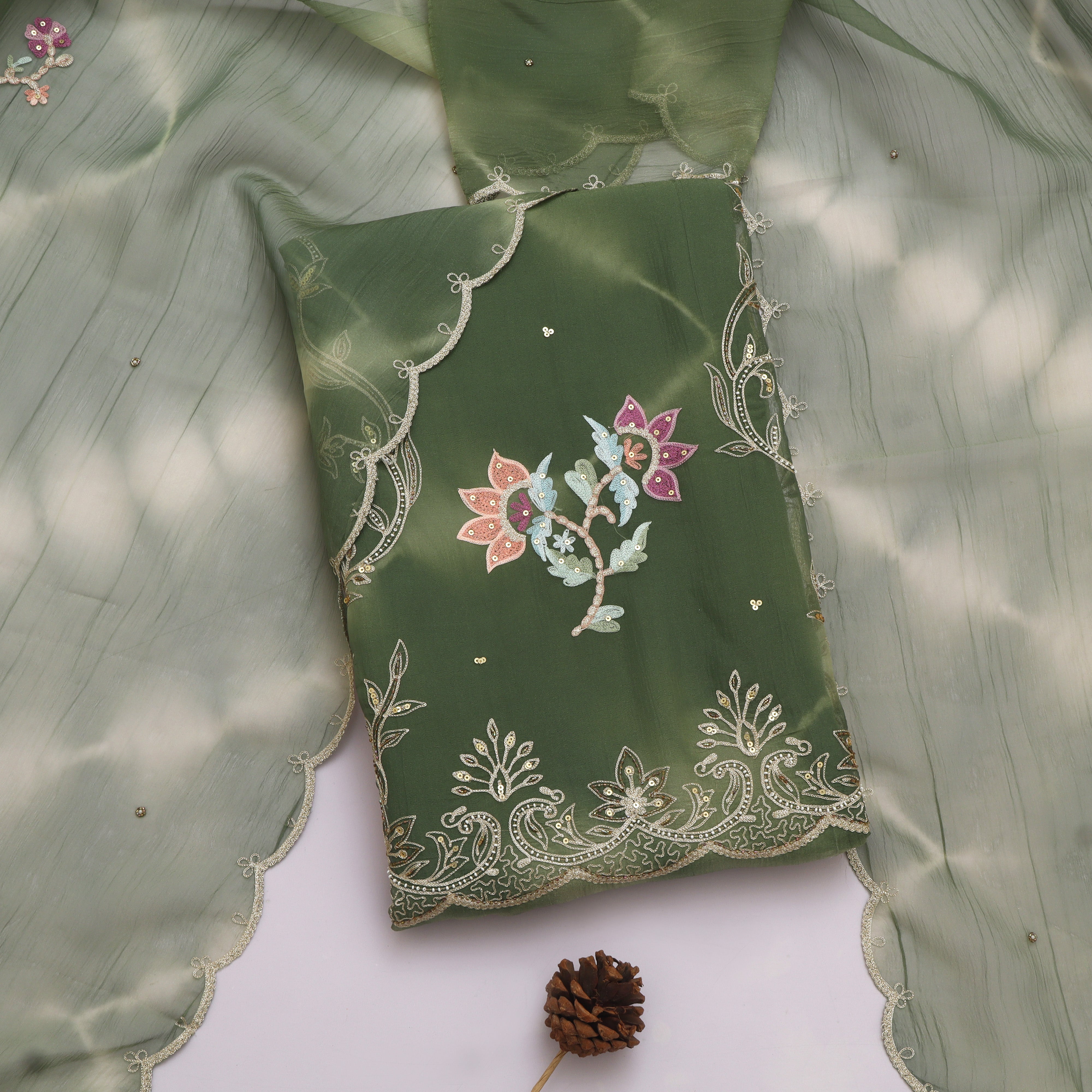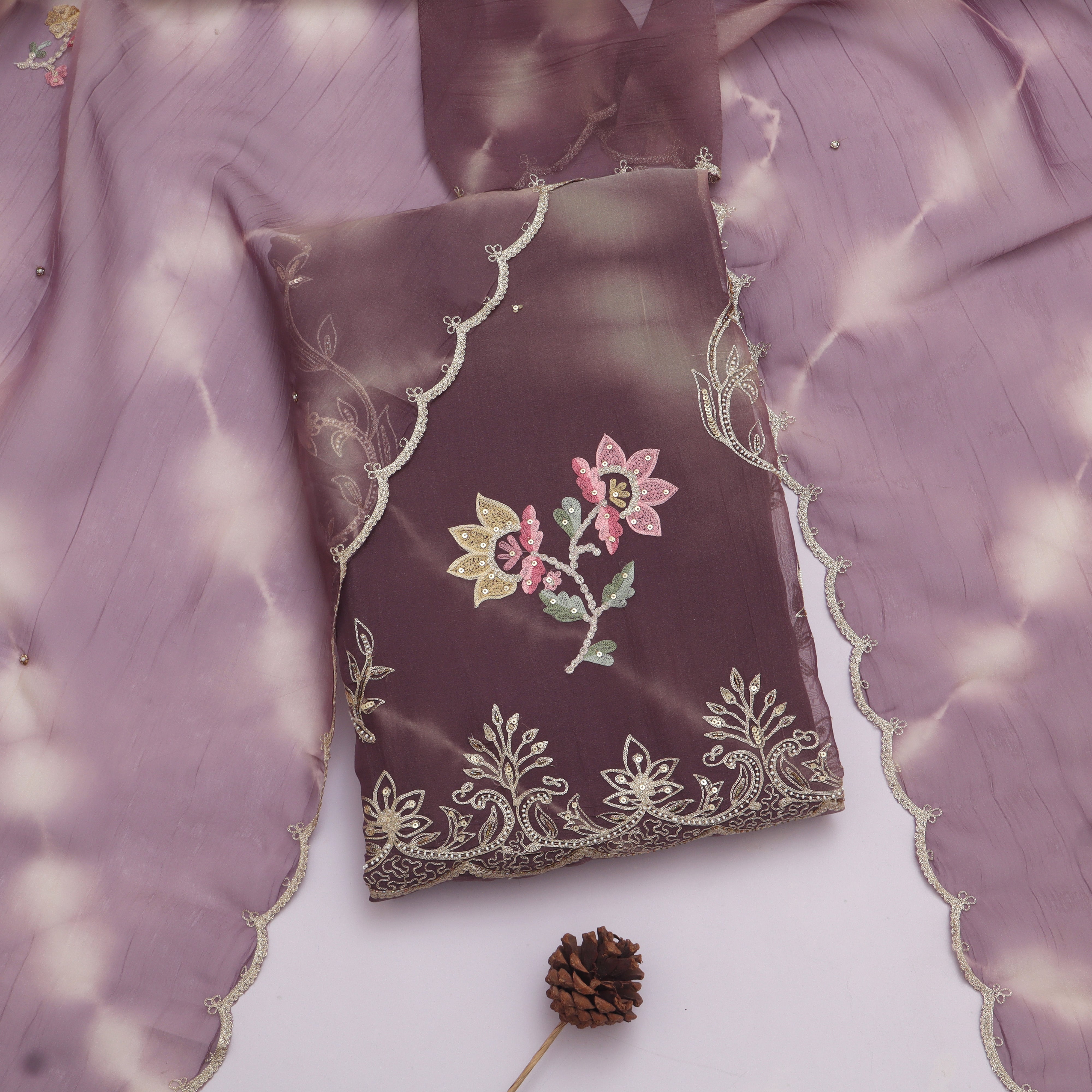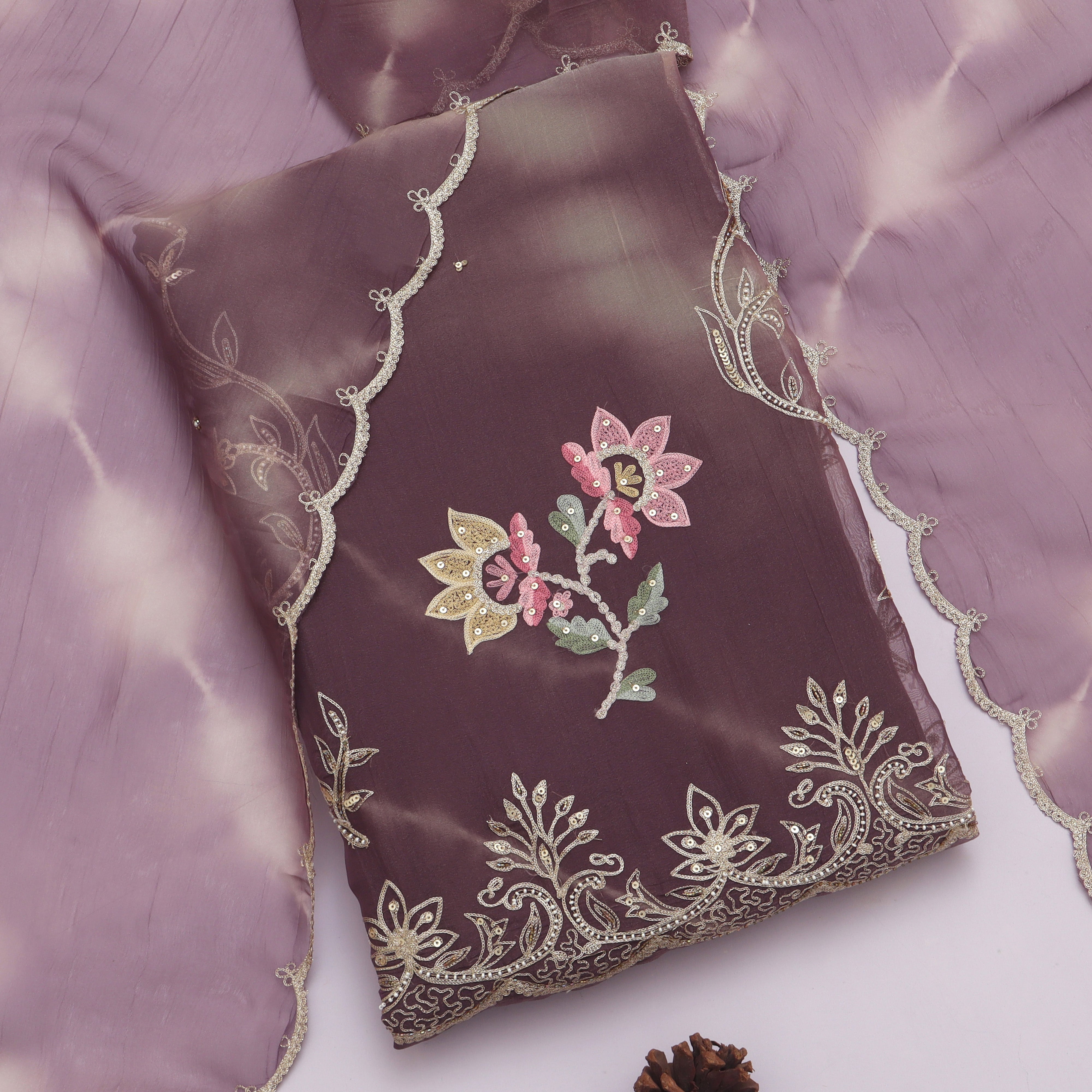 The suit material comes with intricate detailing on the kurta fabric, a matching dupatta with woven motifs, and a plain bottom, giving you the flexibility to style it into your desired silhouette — be it a straight kurta, anarkali, or palazzo set. Its subtle shimmer and graceful appeal make it a timeless addition to your ethnic wardrobe.