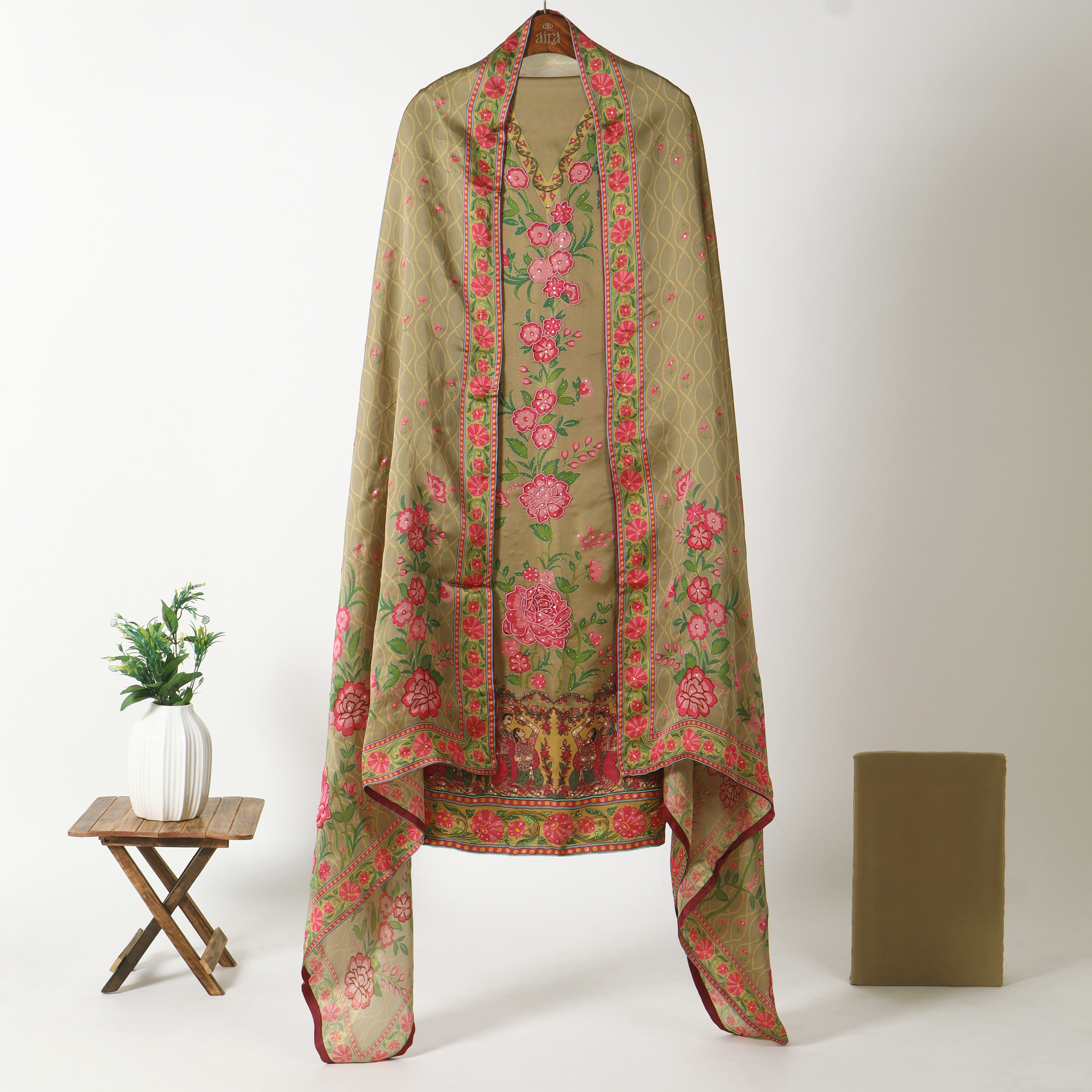 Refresh availabilityElevate your festive wardrobe with this Unstitched Tissue Suit, a perfect blend of luxury and tradition. Crafted from premium tissue fabric, this ensemble radiates a rich sheen and regal charm, making it ideal for special occasions and celebrations.