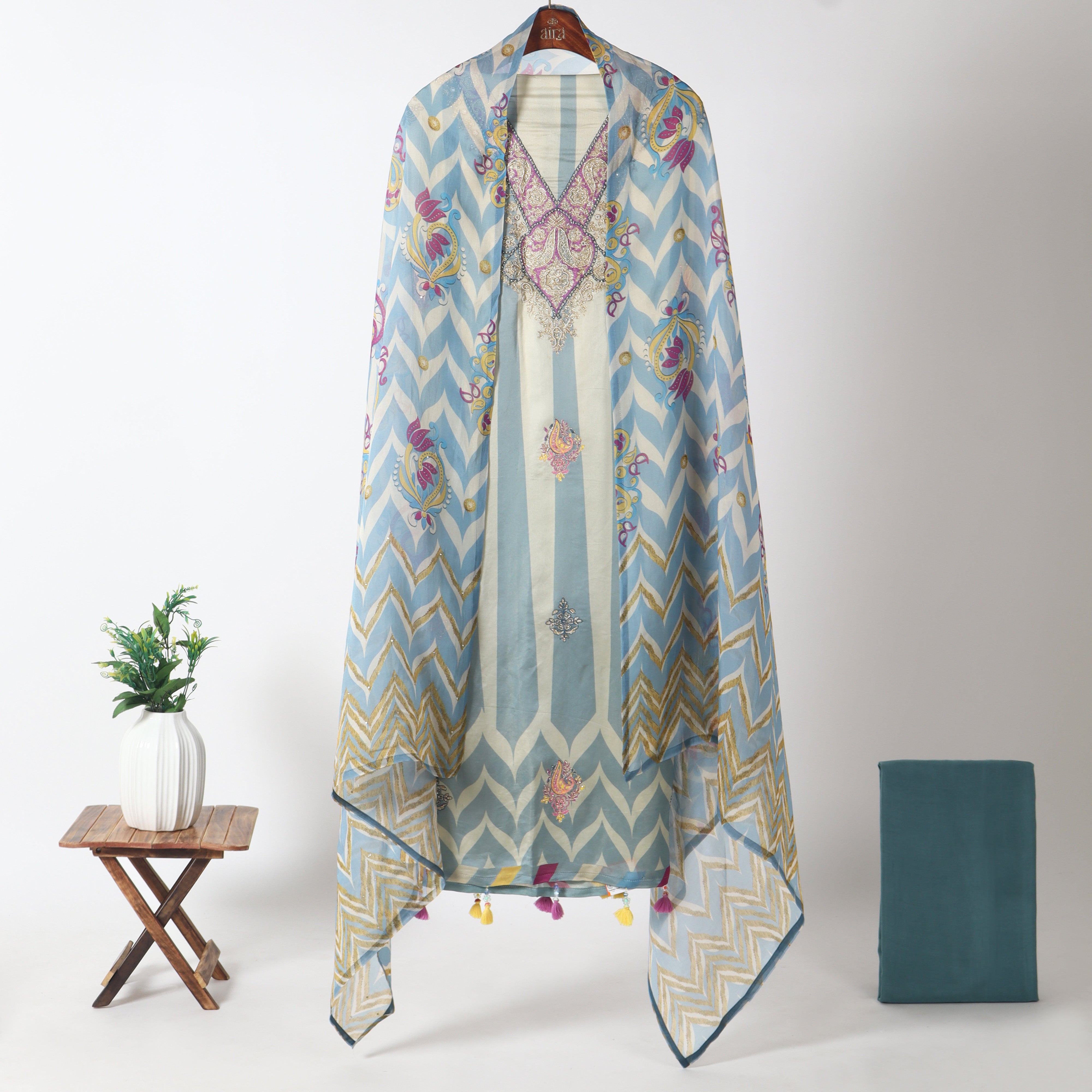 Refresh availabilityAdd a touch of festive grace to your wardrobe with our Unstitched Tissue Suit, crafted from premium tissue fabric known for its soft shimmer, lightweight feel and smooth texture. The fabric drapes beautifully, giving a rich and glamorous look that is perfect for weddings, poojas, celebrations and evening functions.