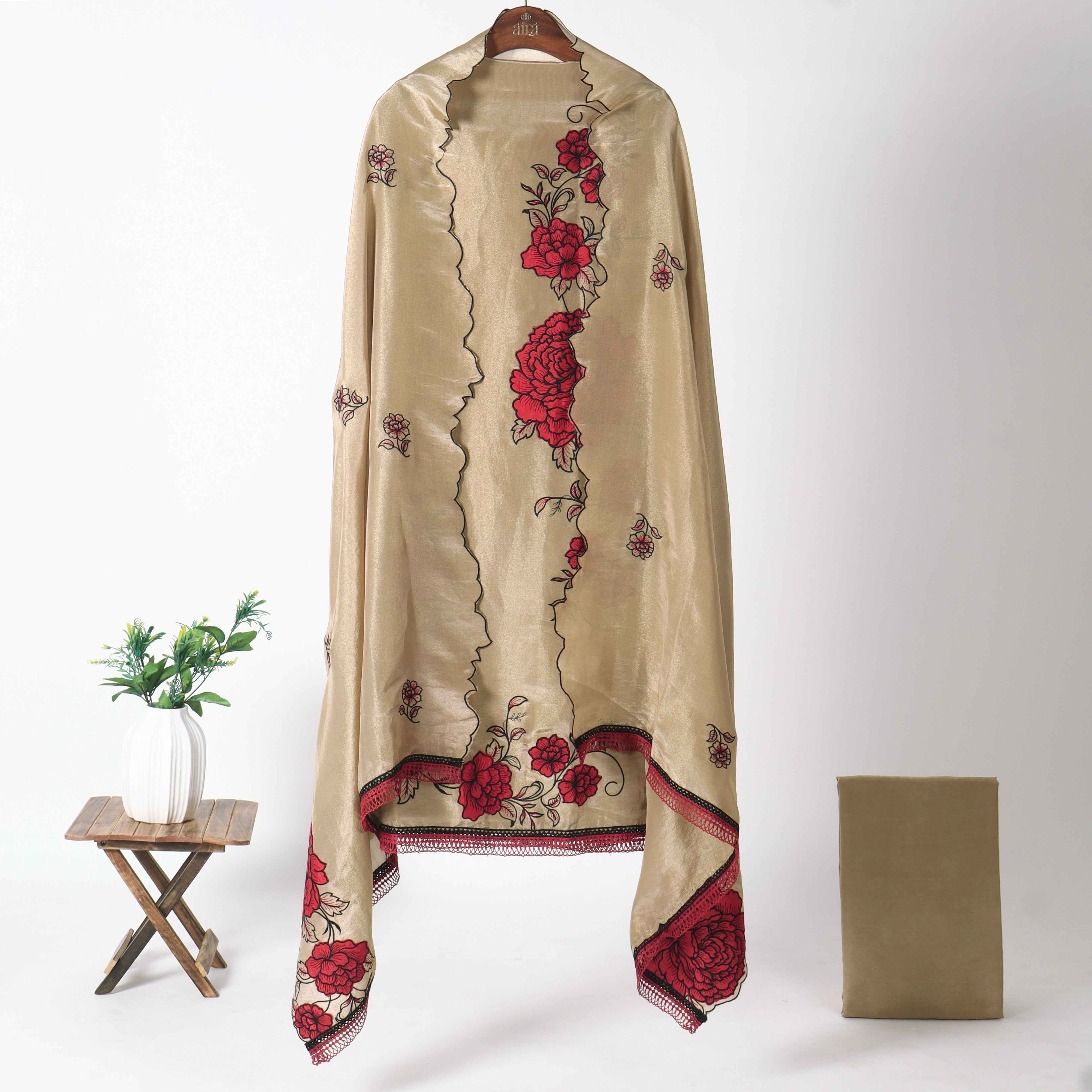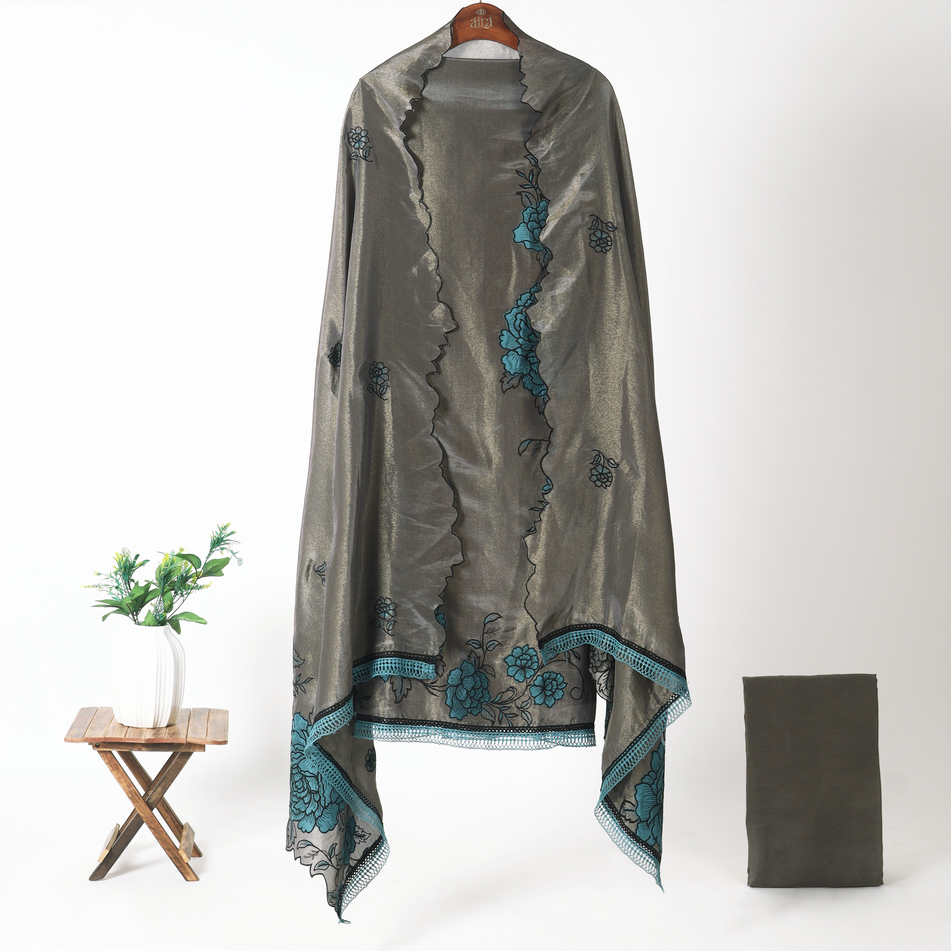 Refresh availabilityIndulge in timeless sophistication with this Unstitched Tissue Suit, crafted from a luxurious, lightweight fabric known for its natural sheen and soft translucent texture. The fabric drapes effortlessly, making it ideal for designing stylish ethnic silhouettes—from straight kurtas to flowy anarkalis. Its subtle shimmer elevates your festive and occasion look with understated glamour. Pair it with elegant accessories for a refined, graceful ensemble that stands out at celebrations and special gatherings.