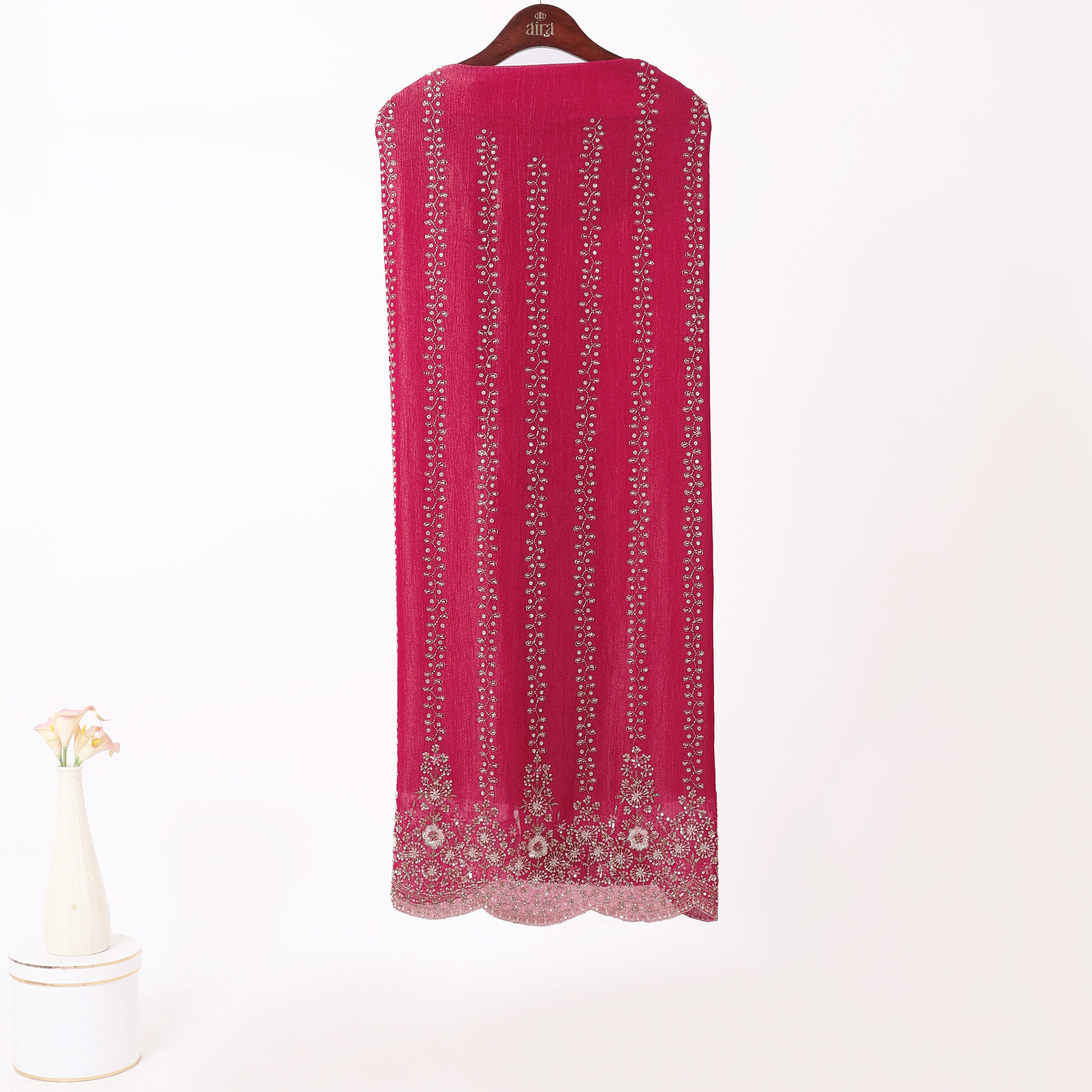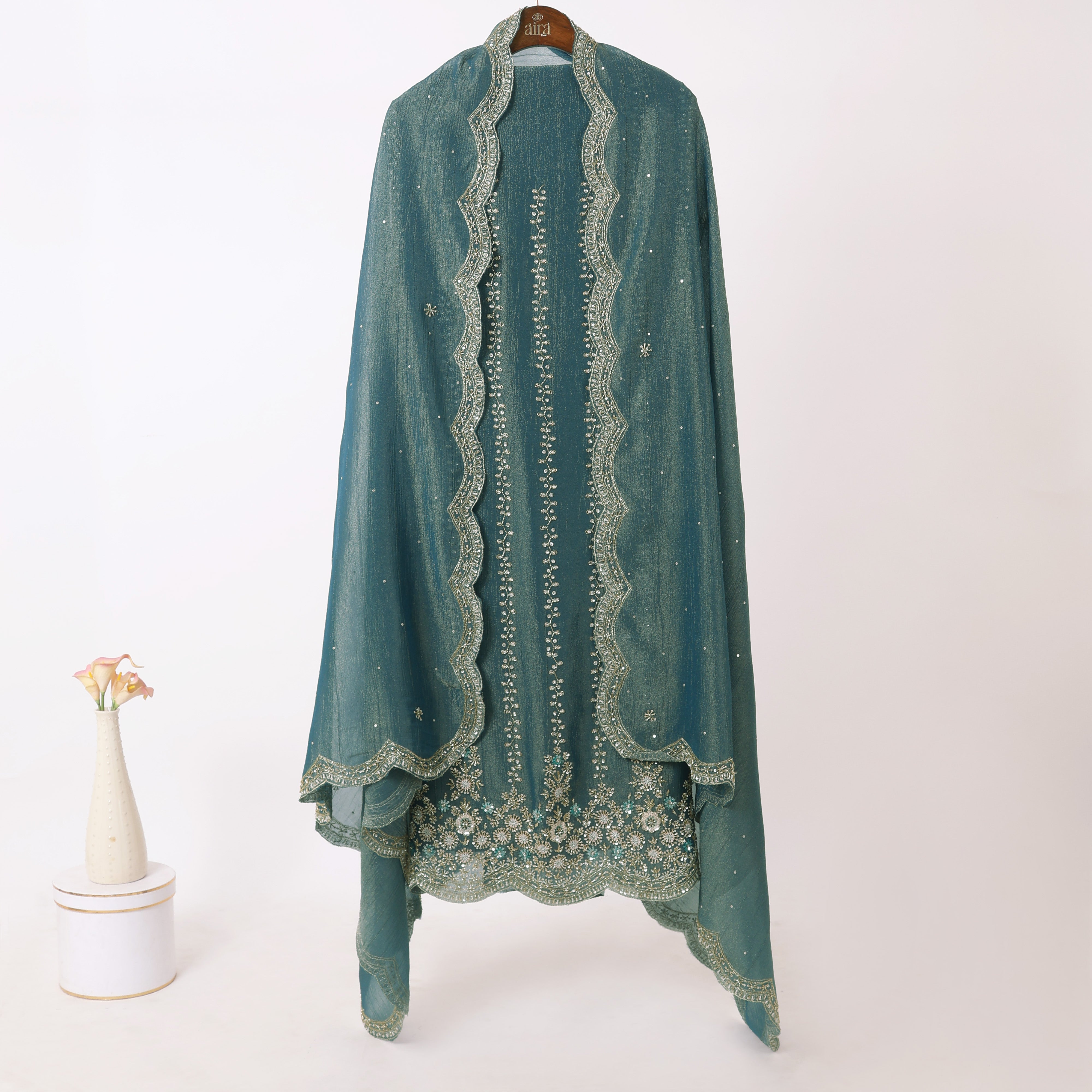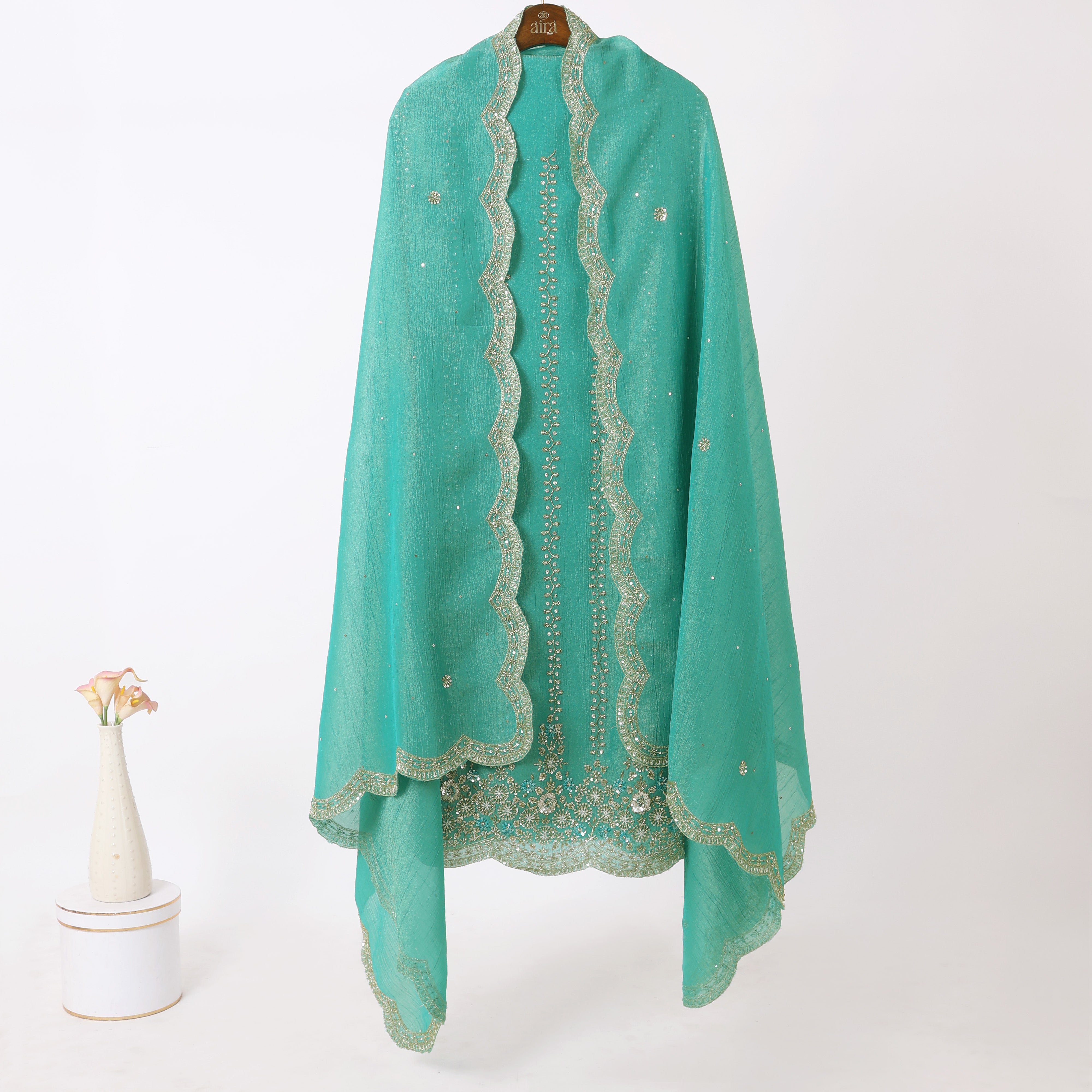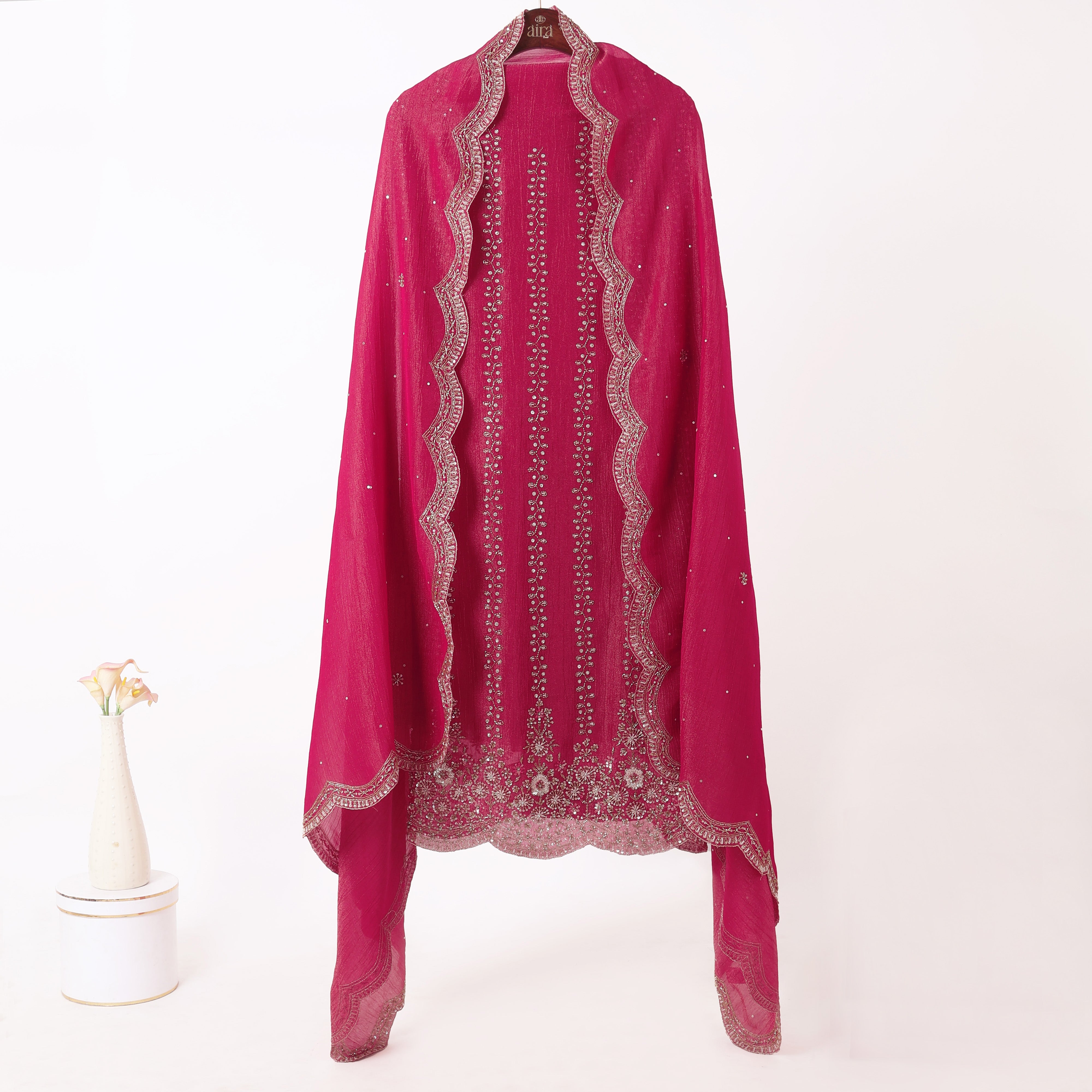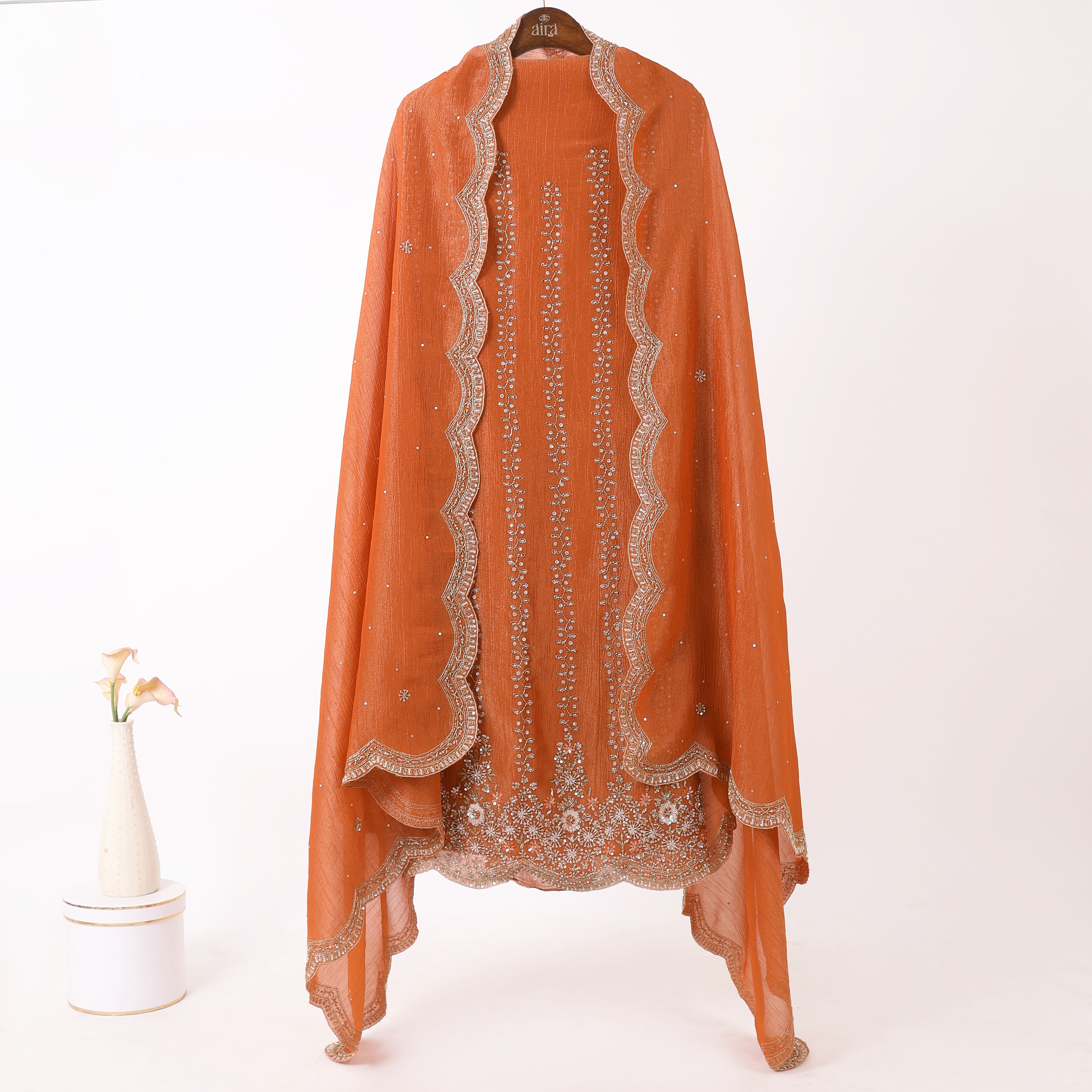 Refresh availabilityExperience timeless grace with our Unstitched Tissue Suit, crafted from premium fabric that offers a soft, natural sheen and luxurious drape. The lightweight texture ensures comfort throughout the day, while its refined finish adds a festive, sophisticated charm. Perfect for celebrations and custom tailoring, it allows you to design a silhouette that truly reflects your style. Paired with a complementing dupatta, this ensemble blends traditional artistry with modern refinement—a beautiful choice for those who love creating their own statement.