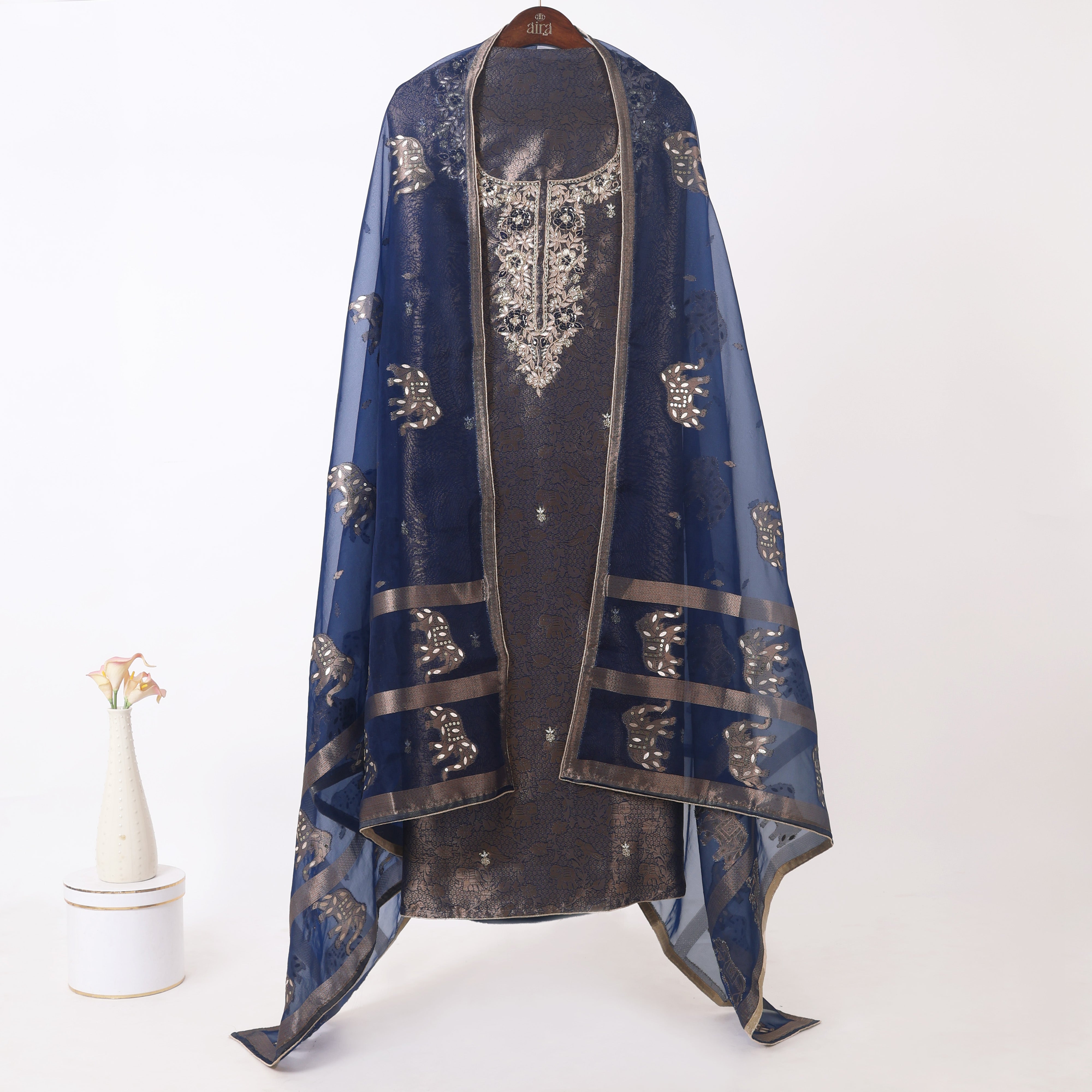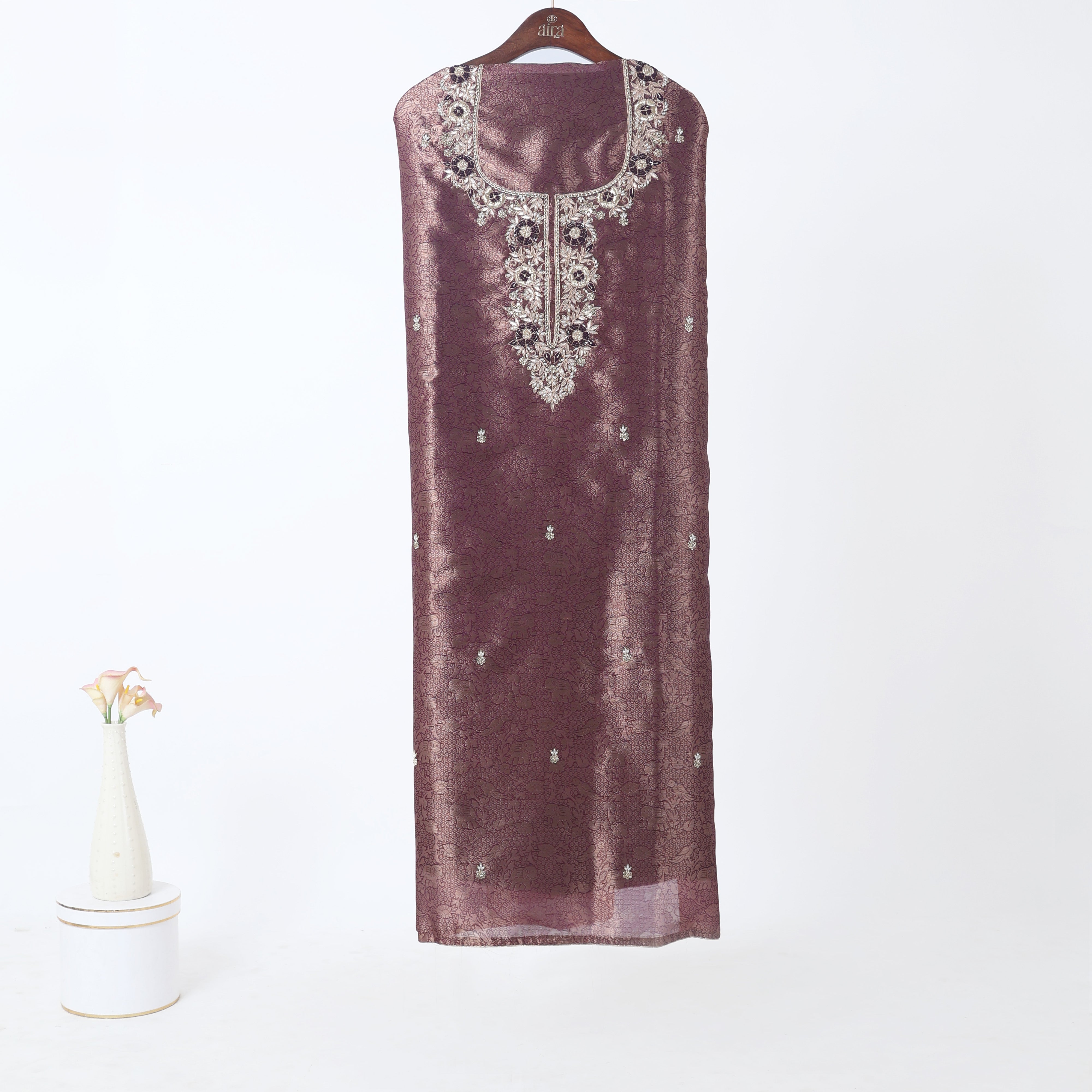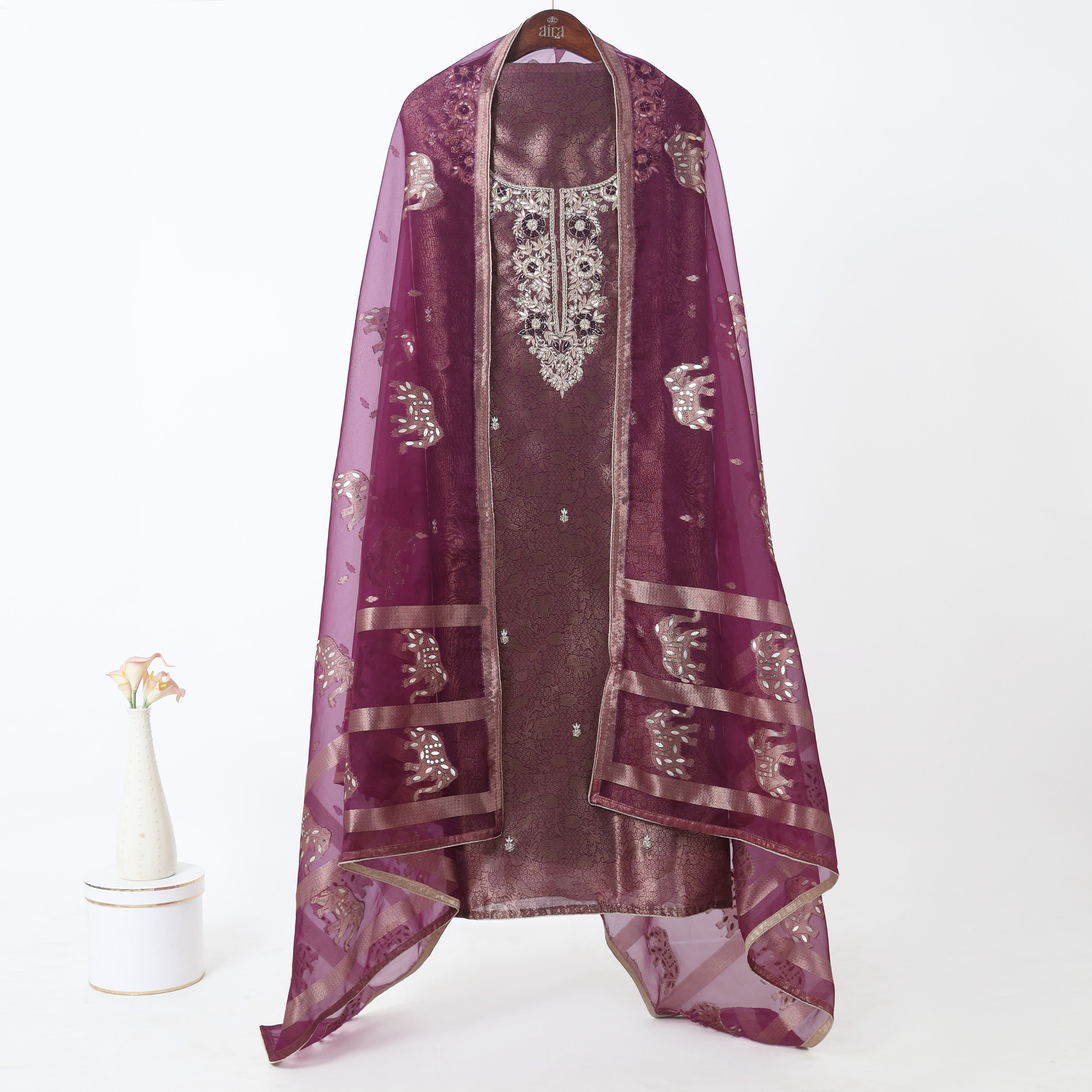 Refresh availabilityExperience timeless grace with our Unstitched Tissue Suit, crafted from premium fabric that offers a soft, natural sheen and luxurious drape. The lightweight texture ensures comfort throughout the day, while its refined finish adds a festive, sophisticated charm.