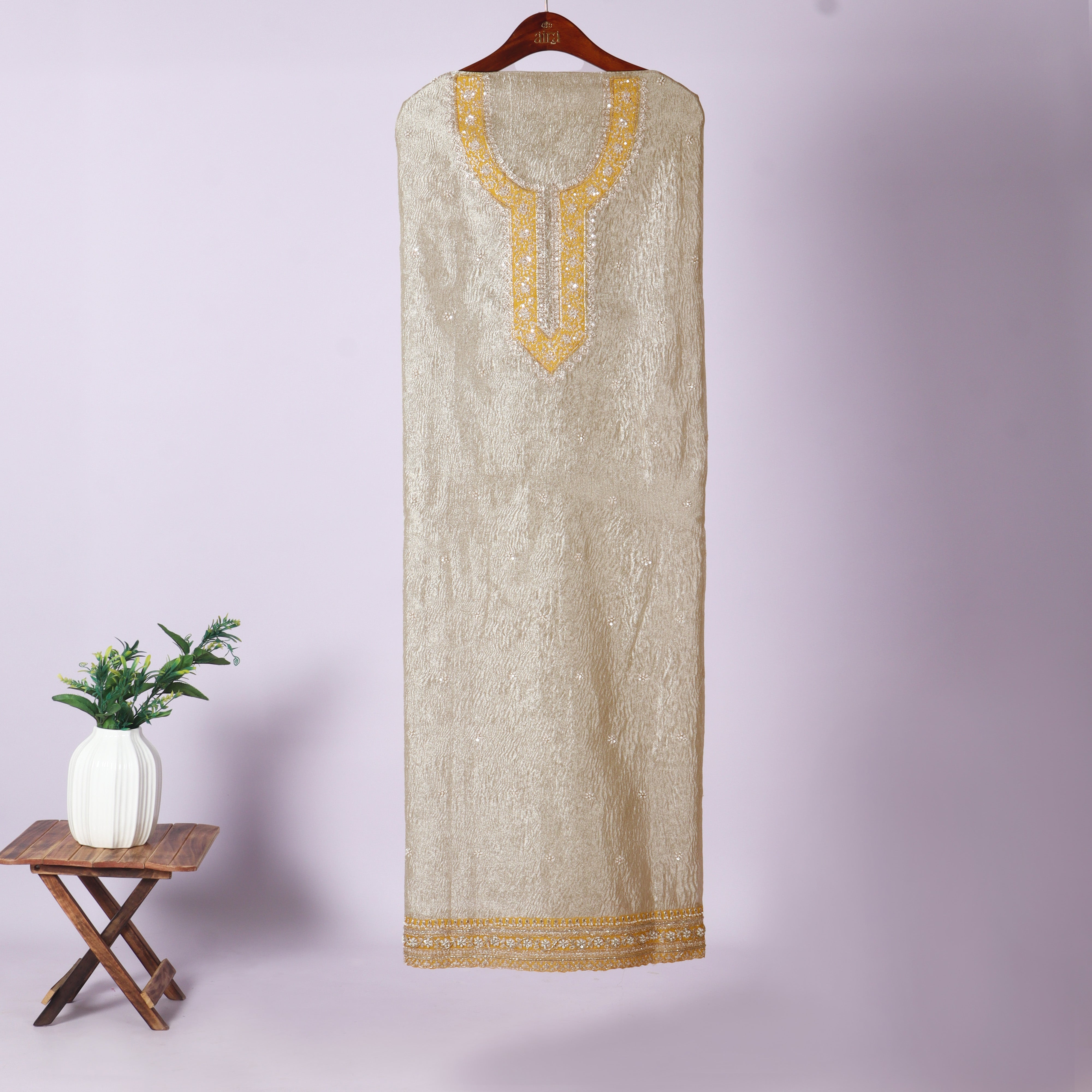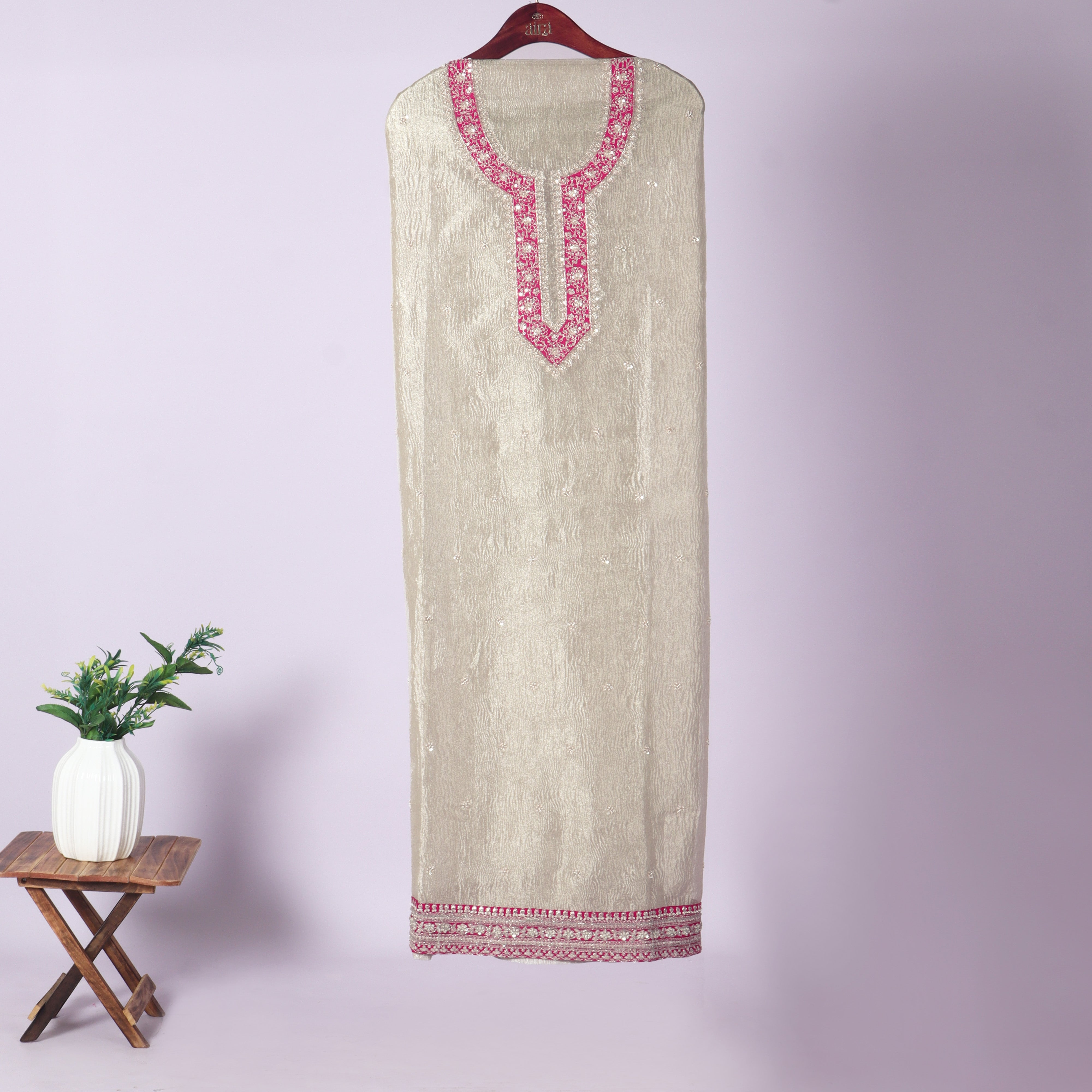 Refresh availabilityExperience timeless grace with our Unstitched Tissue Suit, crafted from premium fabric that offers a soft, natural sheen and luxurious drape. The lightweight texture ensures comfort throughout the day, while its refined finish adds a festive, sophisticated charm. Perfect for celebrations and custom tailoring, it allows you to design a silhouette that truly reflects your style. Paired with a complementing dupatta, this ensemble blends traditional artistry with modern refinement— a beautiful choice for those who love creating their own statement.