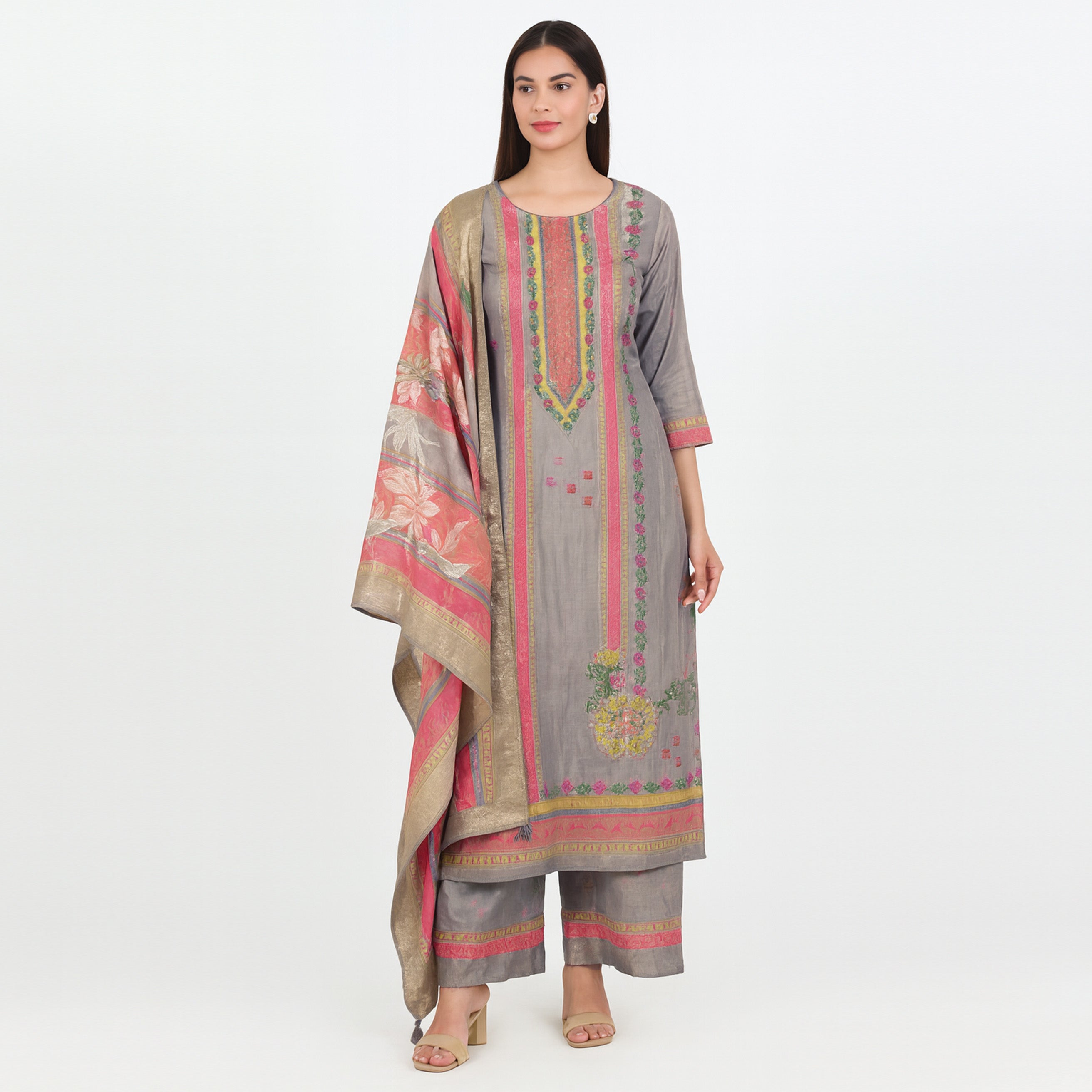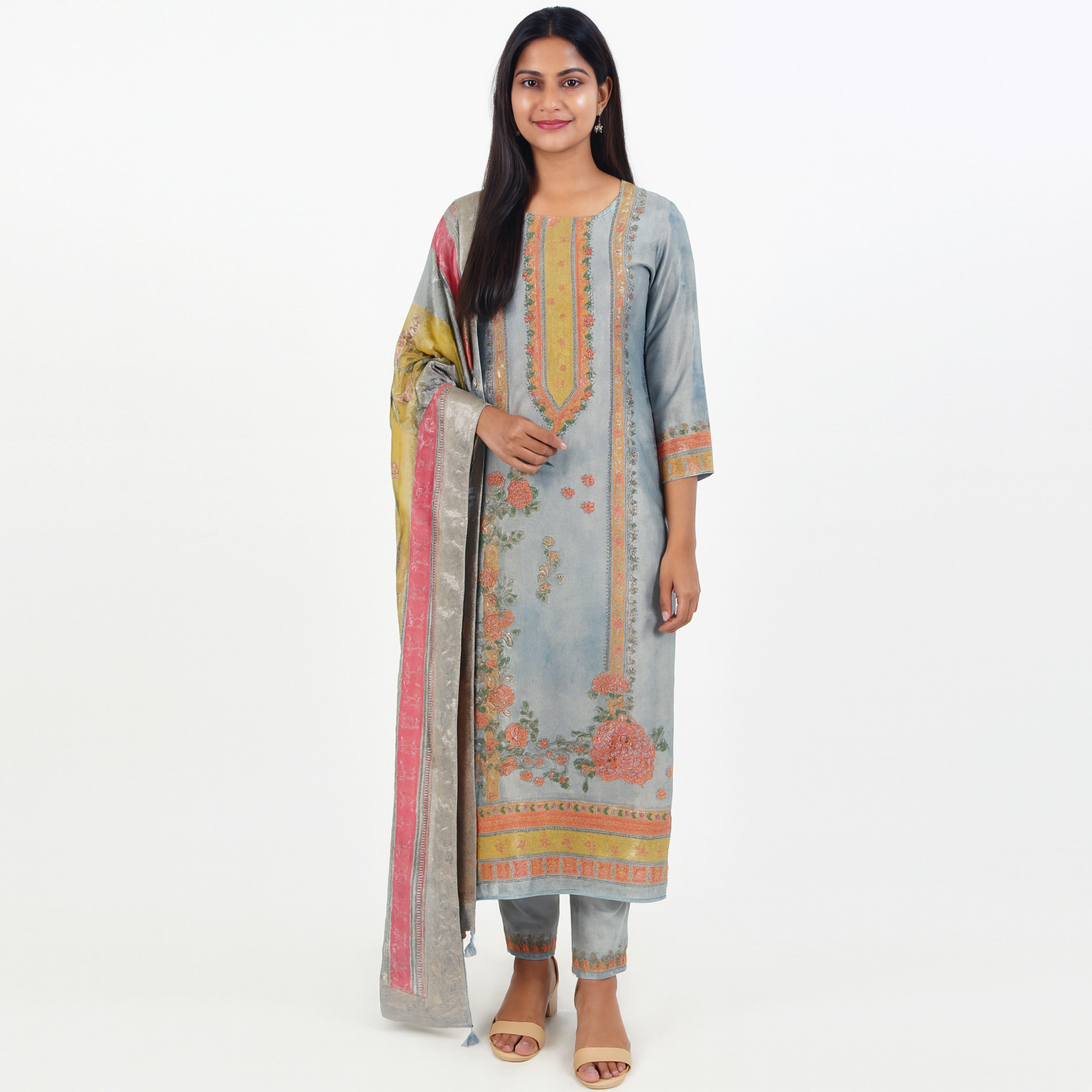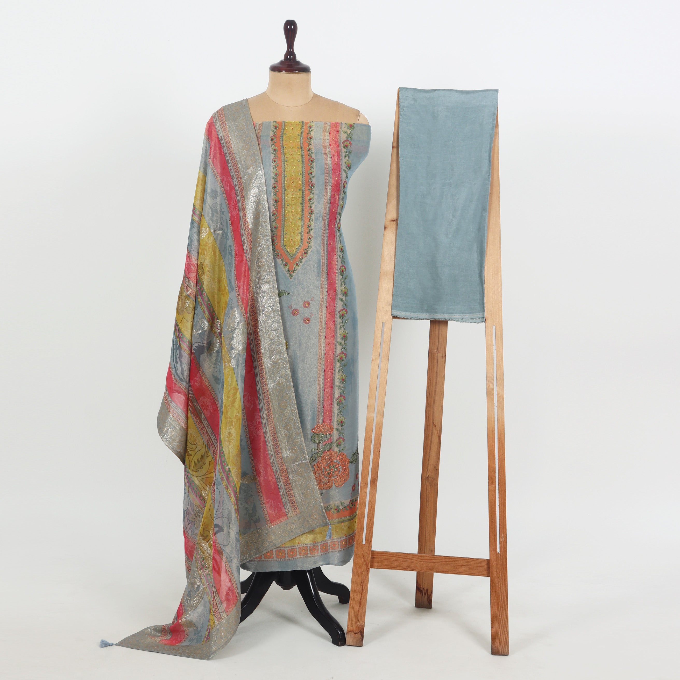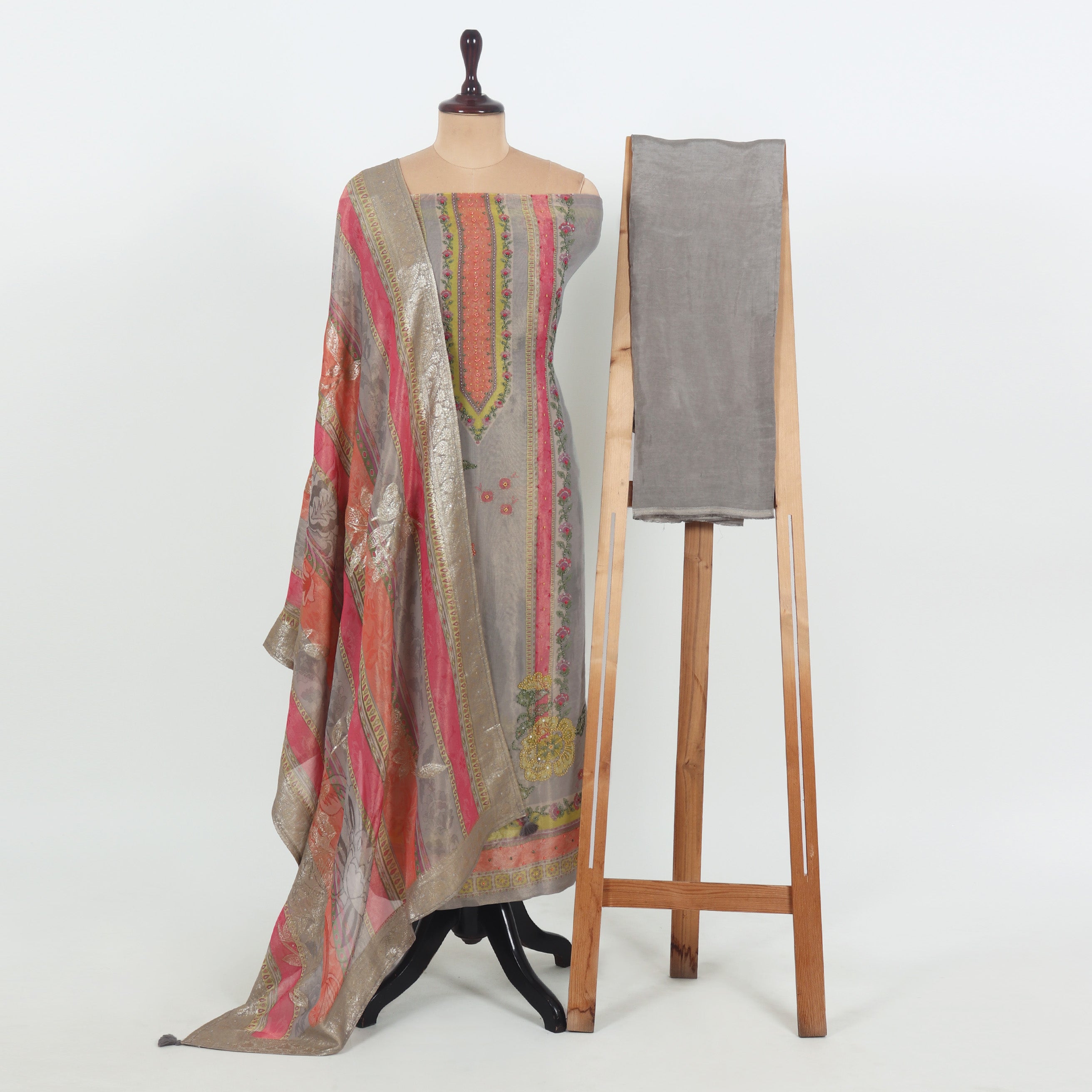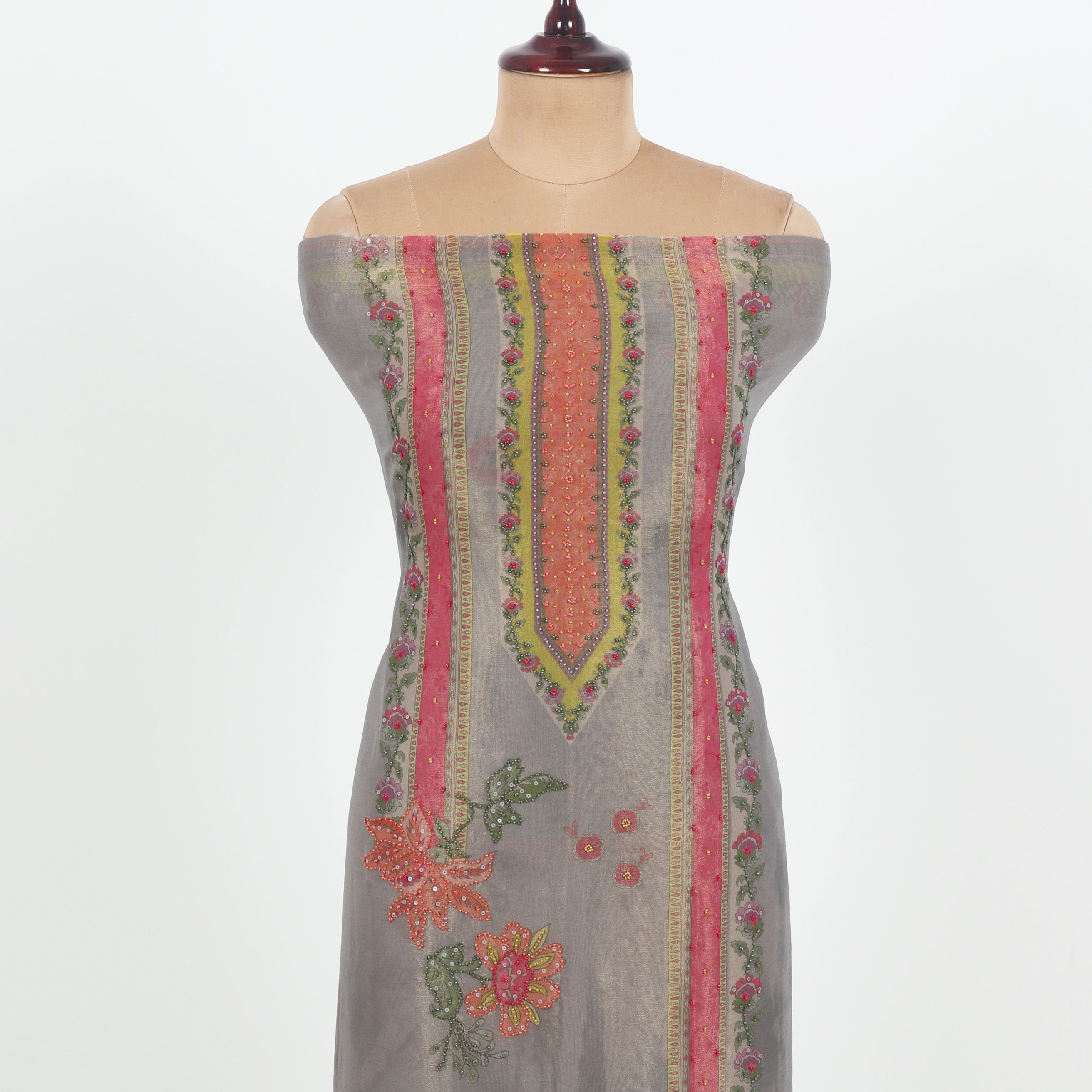 I really loved this unstitched tissue suit! The steel grey base with multicolor accents looks very elegant and unique. The fabric has a soft shimmer that makes it perfect for festive occasions or family gatherings. Since it’s unstitched, I got it tailored exactly to my style and fit – turned out beautifully. A great choice if you like customizing your outfits!