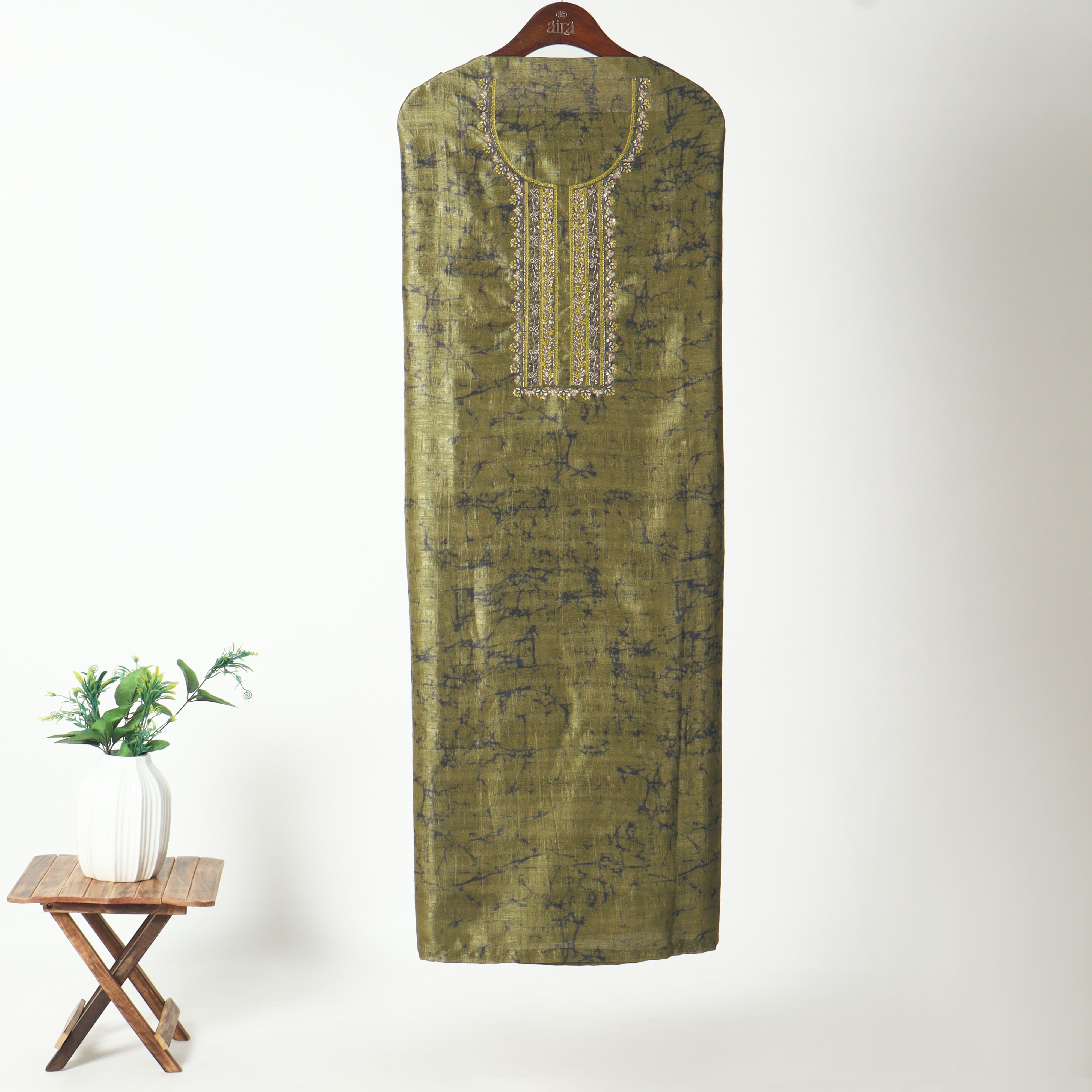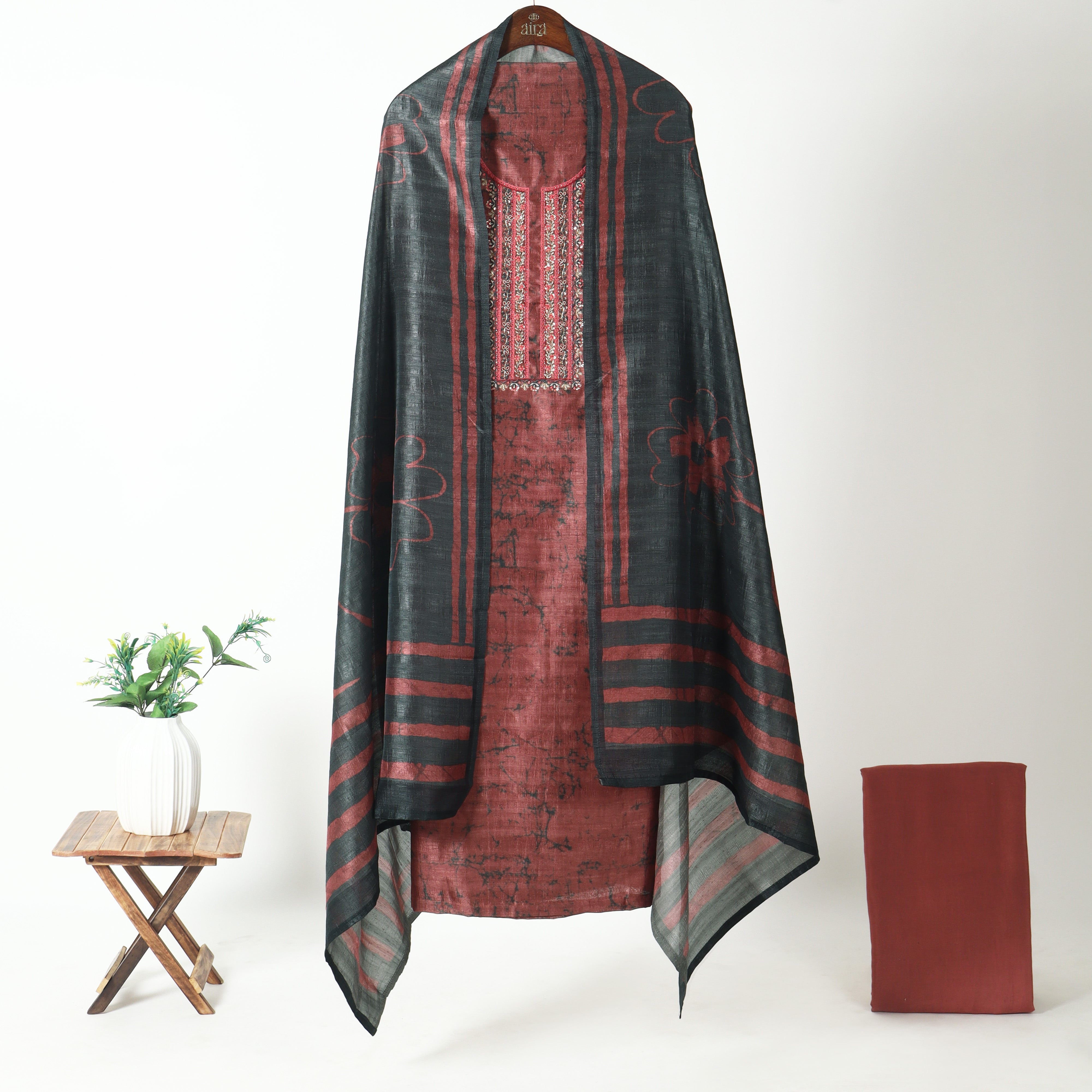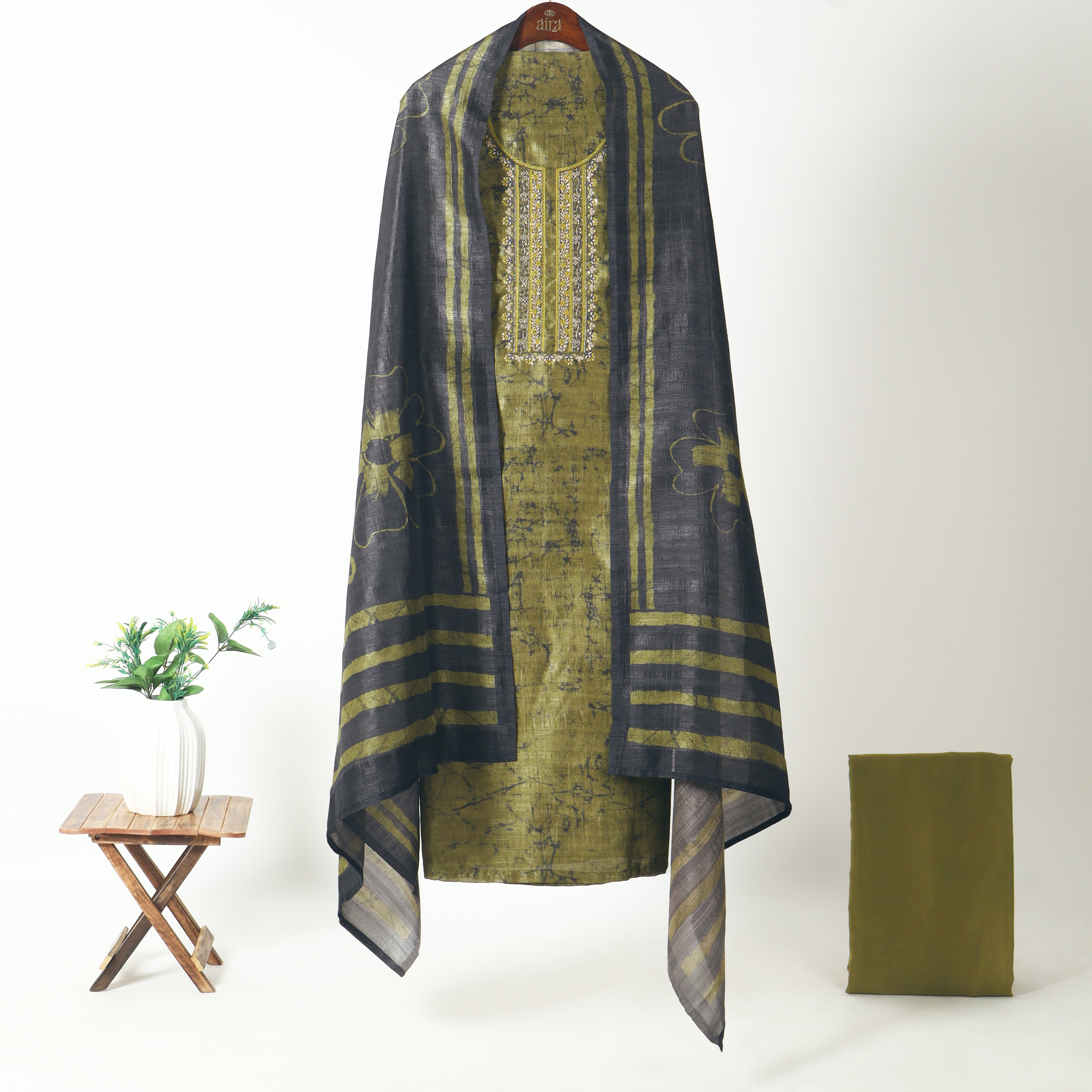 Refresh availabilityElevate your ethnic wardrobe with this elegant Unstitched Tussar Suit, crafted to offer a blend of refined texture and timeless charm. The kurta features a subtle tussar finish with beautifully highlighted printed patterns and a finely detailed neckline that adds a graceful touch to your overall look.