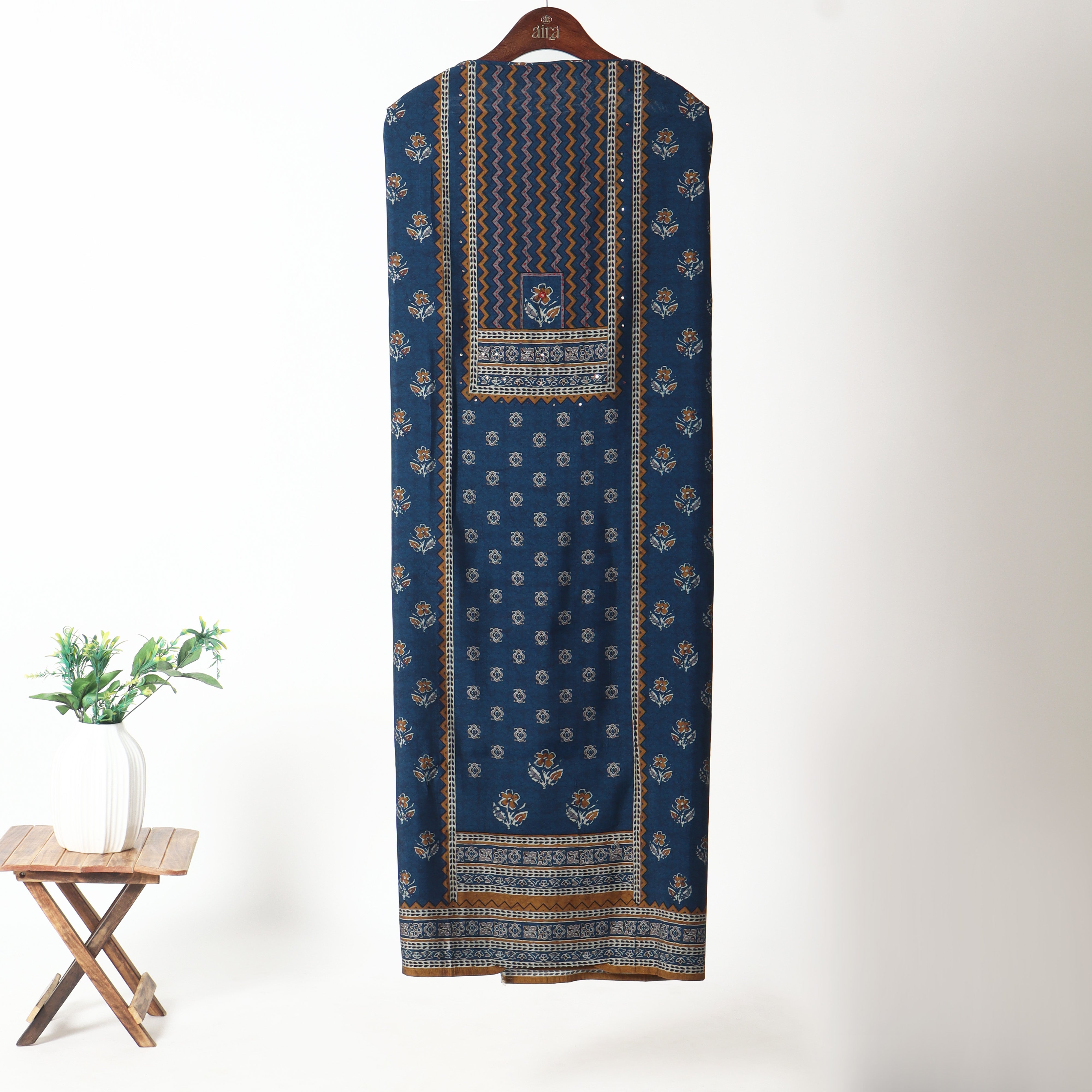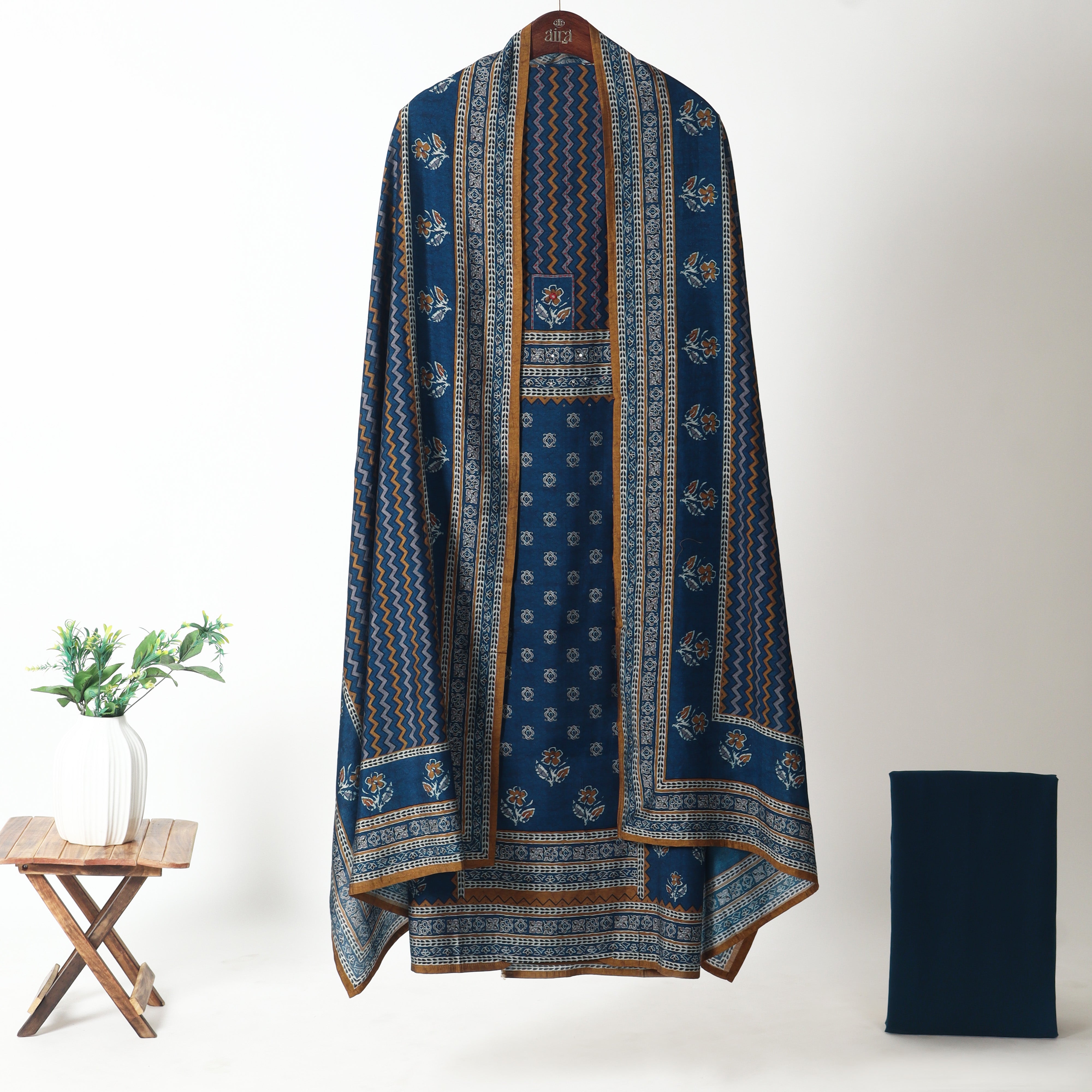 Refresh availabilityElevate your festive and everyday wardrobe with this exquisite Unstitched Tussar Suit in a rich navy blue hue. Designed with traditional charm and modern sophistication, the fabric features intricate block-inspired motifs, highlighted with beautifully coordinated borders and pallu patterns.