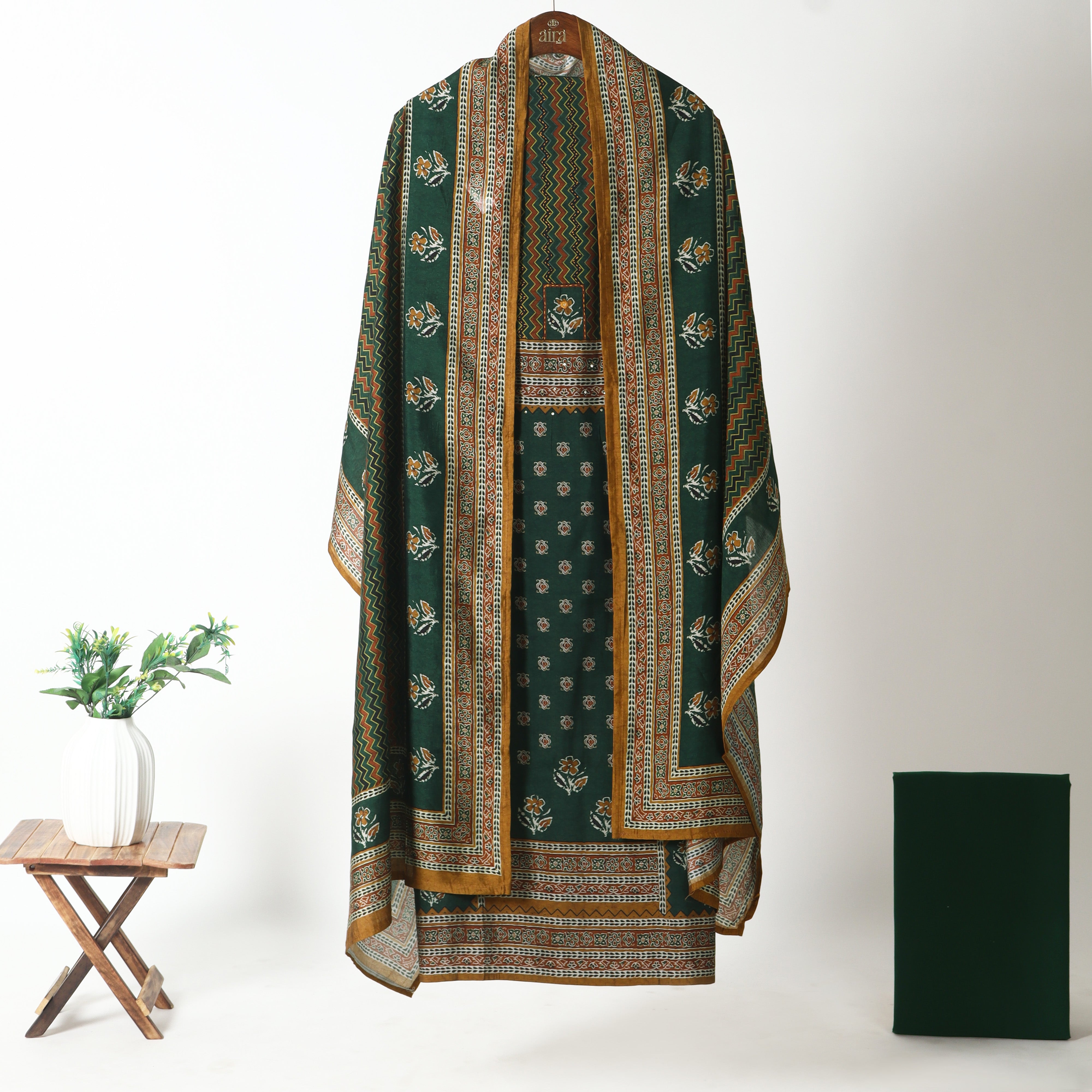 Crafted from soft and lightweight tussar-blend fabric, it drapes effortlessly, offering comfort along with an elegant fall. The suit comes with a matching solid bottom fabric, allowing you to tailor it perfectly to your preferred style.