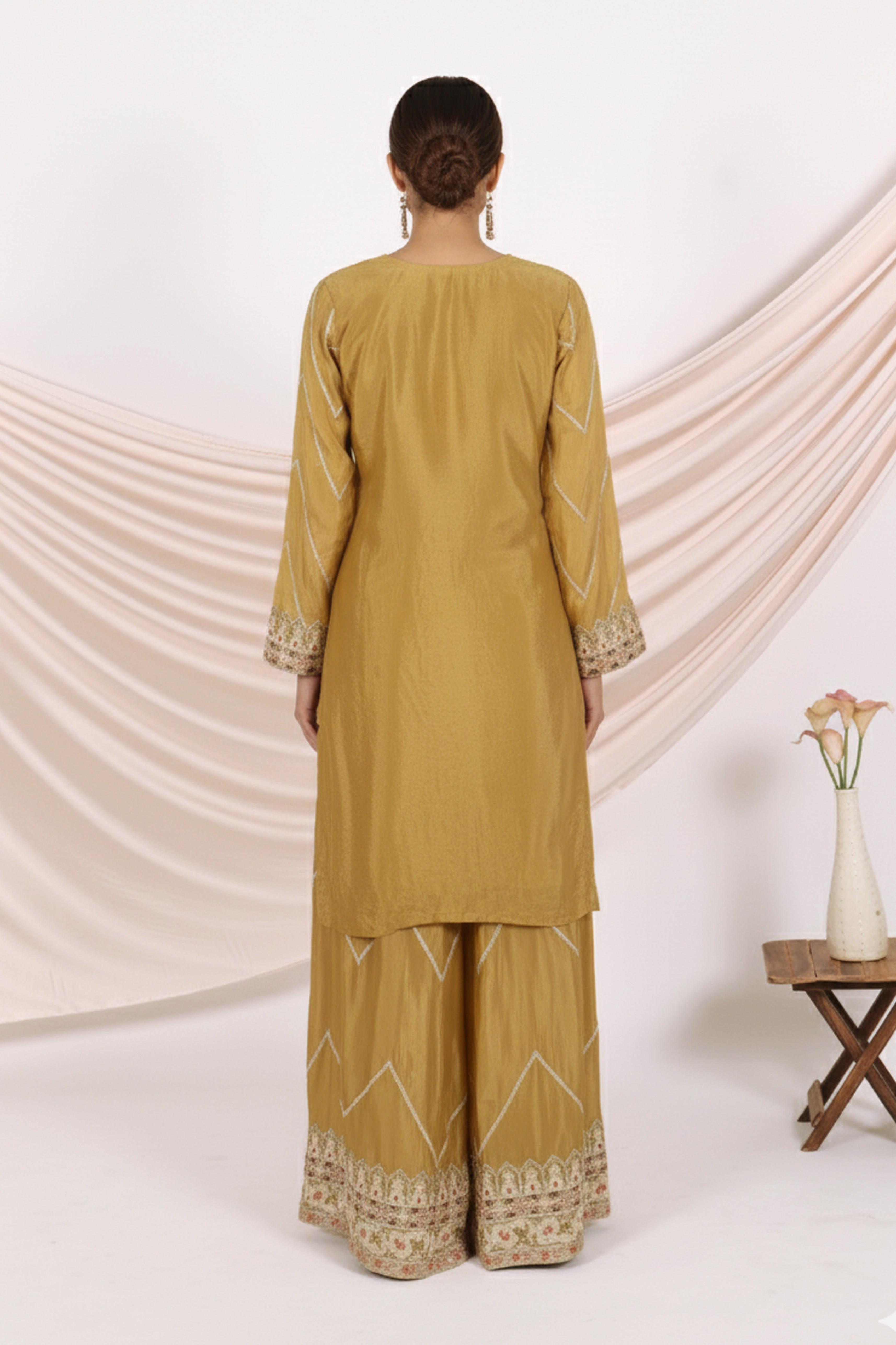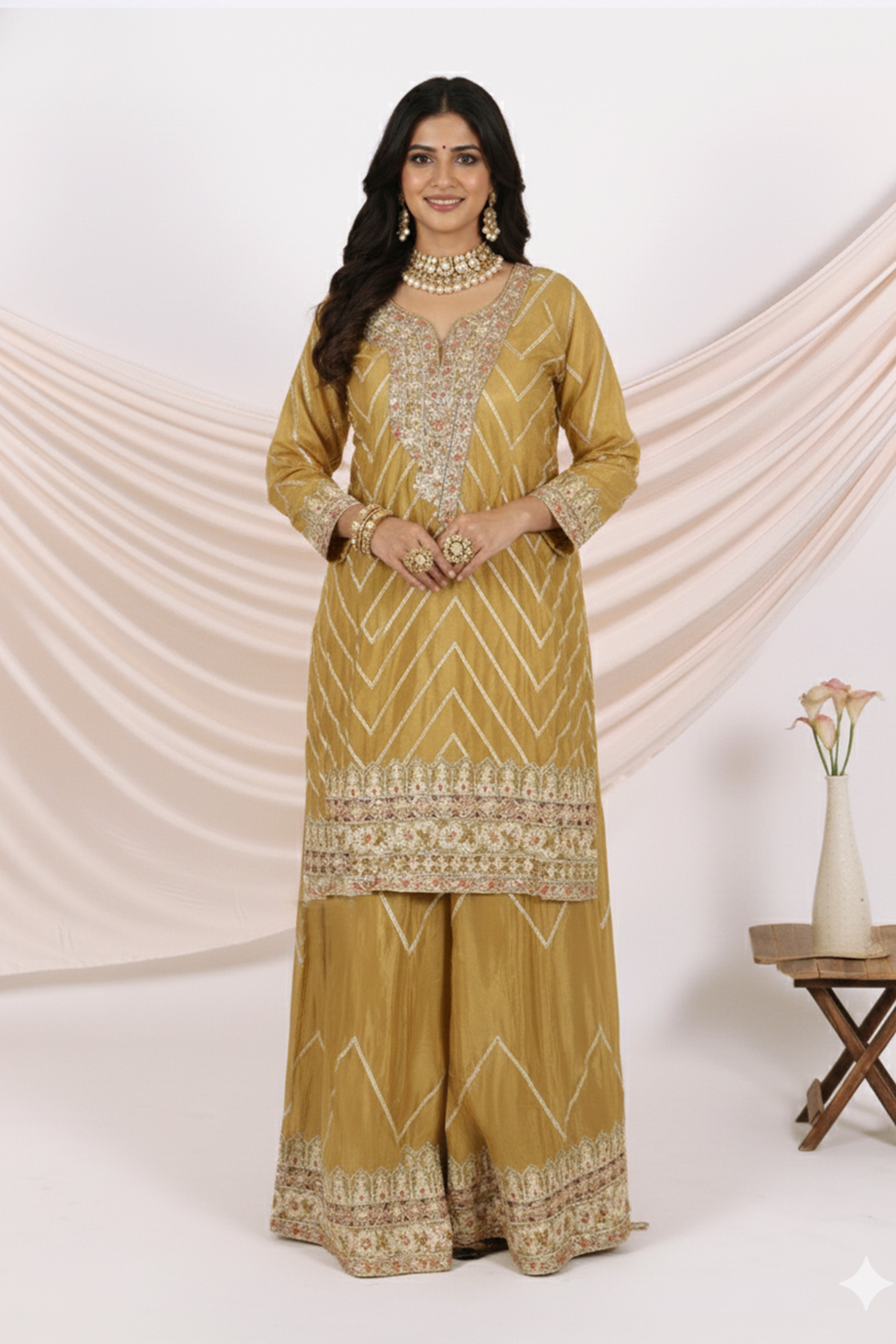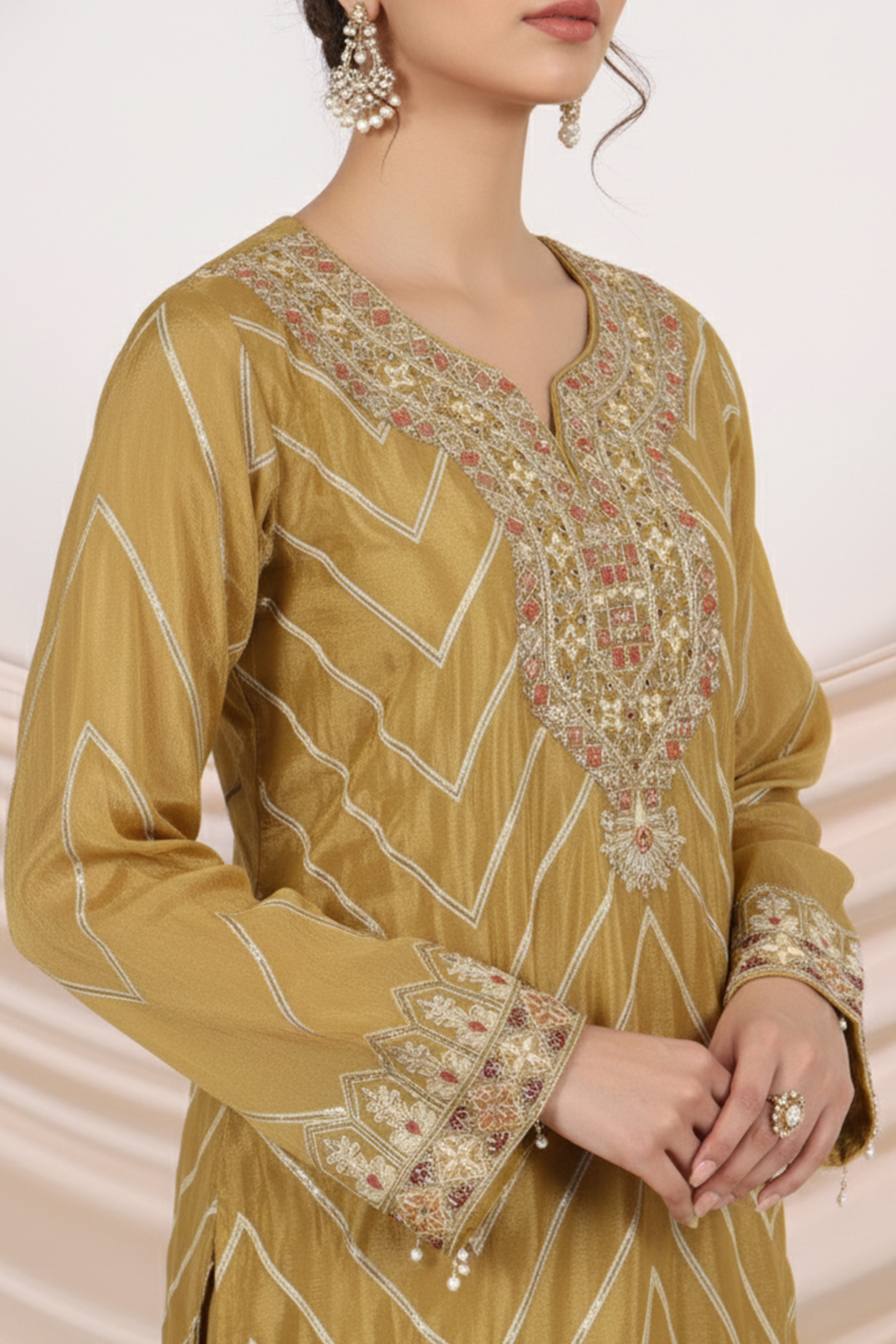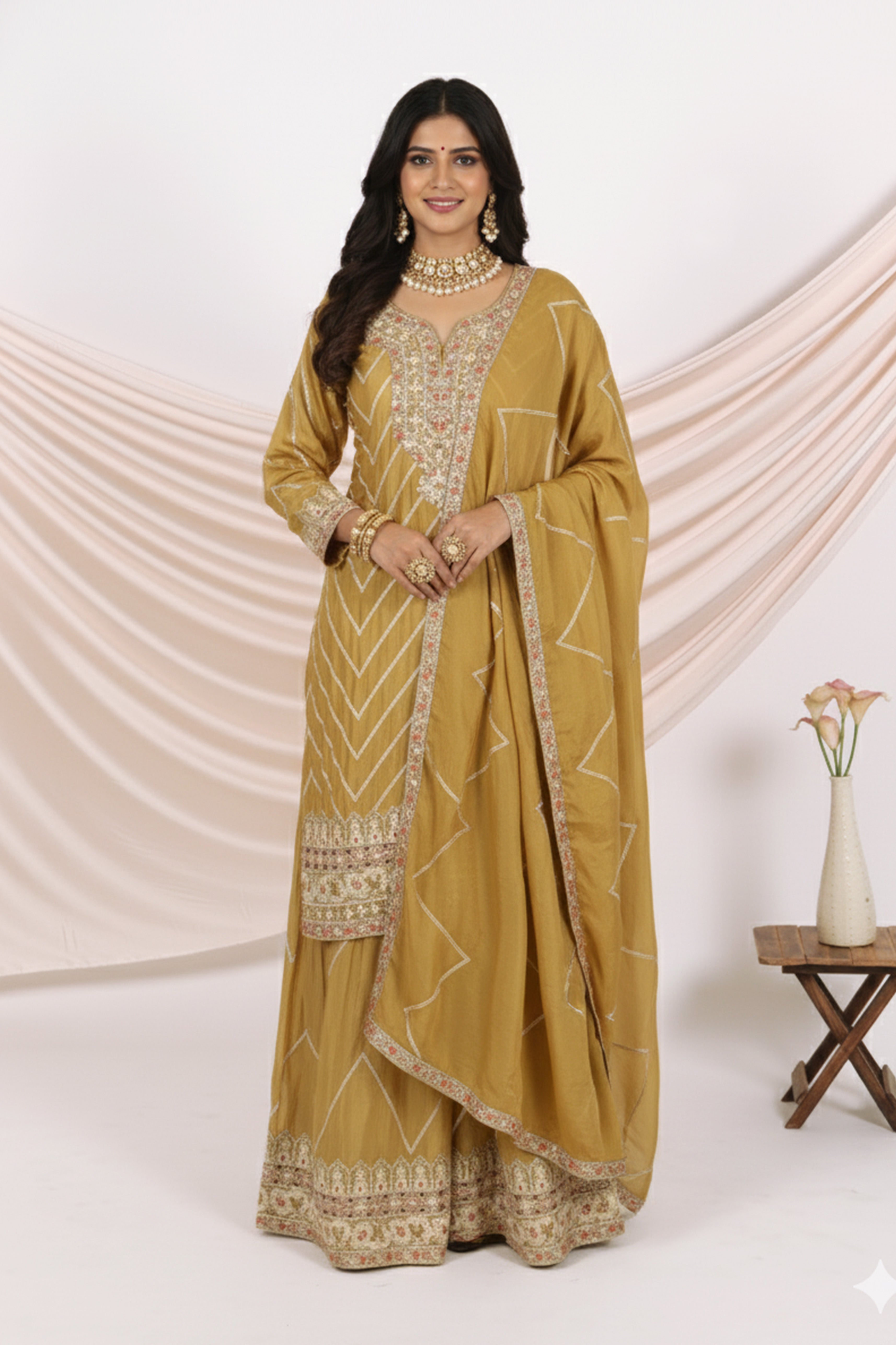 Refresh availabilityRadiate festive charm in this Zari Embroidered Sharara Set. Crafted from rich fabric, the kurta features elegant zari, thread, and sequin embroidery along the neckline, sleeves, and hem. The flared sharara adds a graceful touch with its intricate border work, while the matching dupatta with embroidered scalloped edges completes the regal look. Perfect for festive celebrations, mehendi, and wedding functions.
